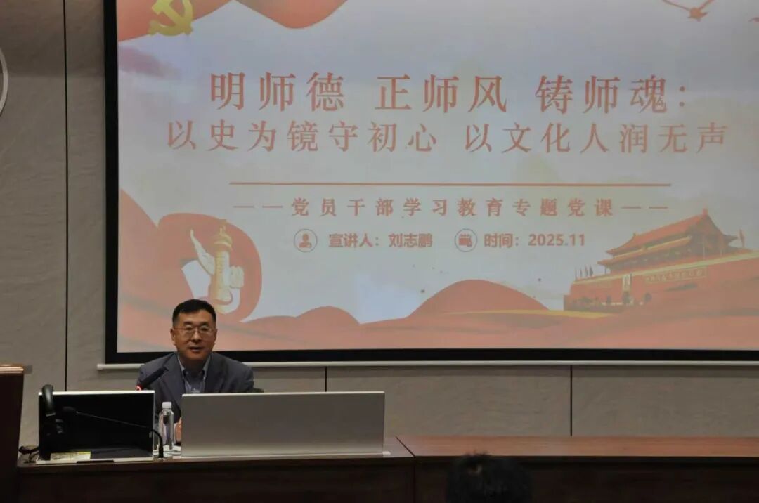 刘志鹏教授以“明师德 正师风 铸师魂:以史为镜守初心 以文化人润无声”为主题,围绕学院廉洁文化教育,引用习近平总书记重要论述,分别从“以史为鉴”“以文化人”“以行为本”三个方面,强调了师德师风建设的时代意义。通过梳理党的纪律建设史,系统阐释了党要管党、全面从严治党的优良传统,揭示了纪律严明是党的生命线。通过讲述陶行知“捧着一颗心来,不带半根草去”的奉献精神和张桂梅校长的“燃灯人生”,生动诠释了新时代师德的崇高内涵。并号召外院师生将党史智慧与师德规范融入育人实践,聚焦培养堪当民族复兴大任的时代新人,强化全员全程全方位育人意识,以树人为核心,以立德为根本,把思想政治教育贯穿人才培养全过程,切实担当起为党育人、为国育才的时代重任。