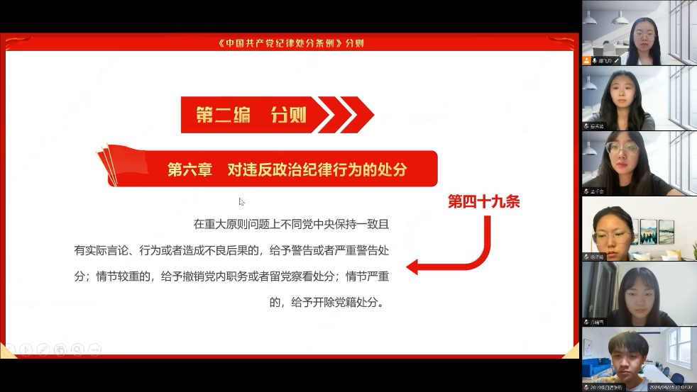 为进一步增强学习贯彻《中国共产党纪律处分条例》的政治自觉、思想自觉和行动自觉,教育引导全体党员强化纪律意识,提高党性修养,2024年4月26日晚,英国正版365首页学生第二党支部组织支部全体党员开展学习《条例》主题党课,进行线上集中纪律教育。