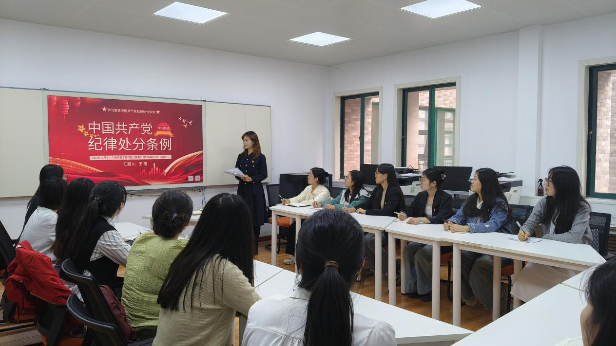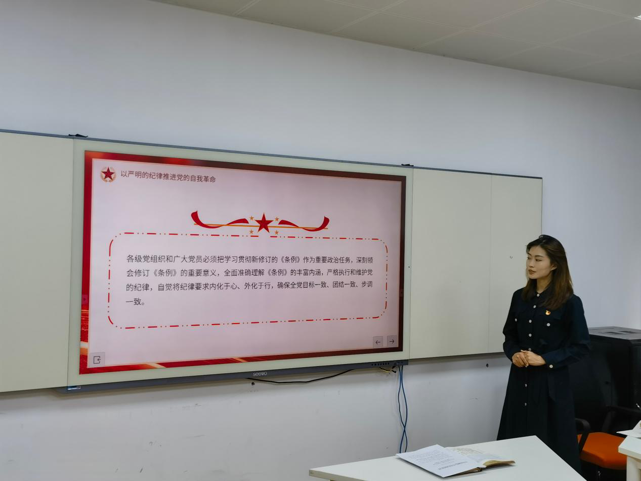 会议伊始,党支部书记王丽向全体党员同志传达了学校关于认真学习贯彻《中国共产党纪律处分条例》的通知,以解读《条例》总则部分为切入点,从深刻认识修订《条例》的重要意义、准确把握《条例》修订的主旨要义、抓好《条例》的贯彻执行和党员干部要做遵规守纪的模范等方面,紧密联系典型案例,引导大家系统学习理解《条例》。随后,王丽同志带领全体党员深入解读修订后的《条例》的突出特点。