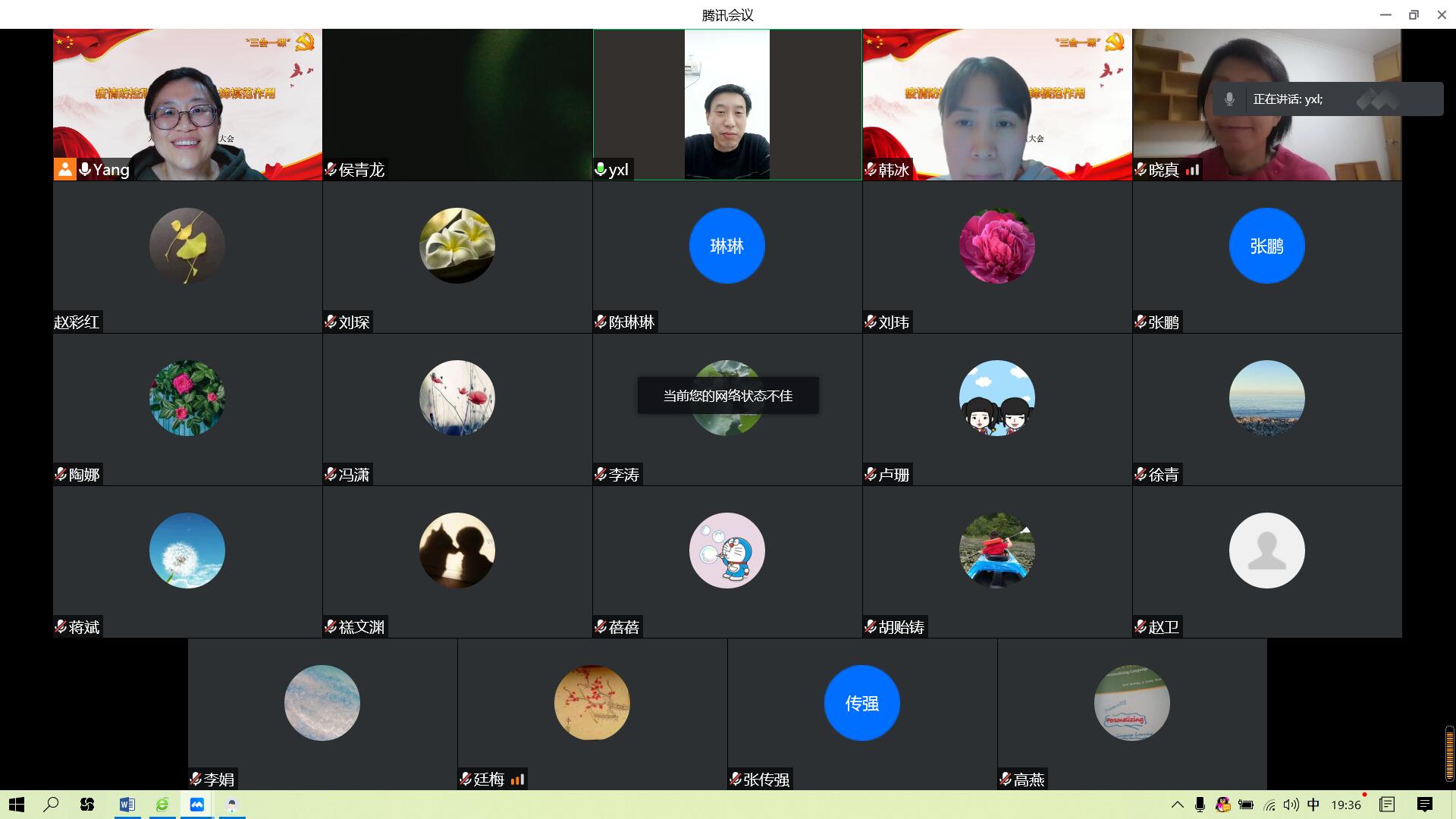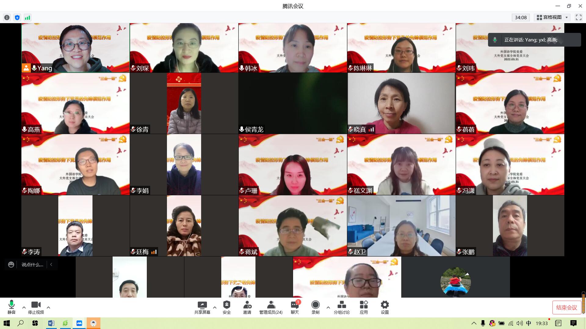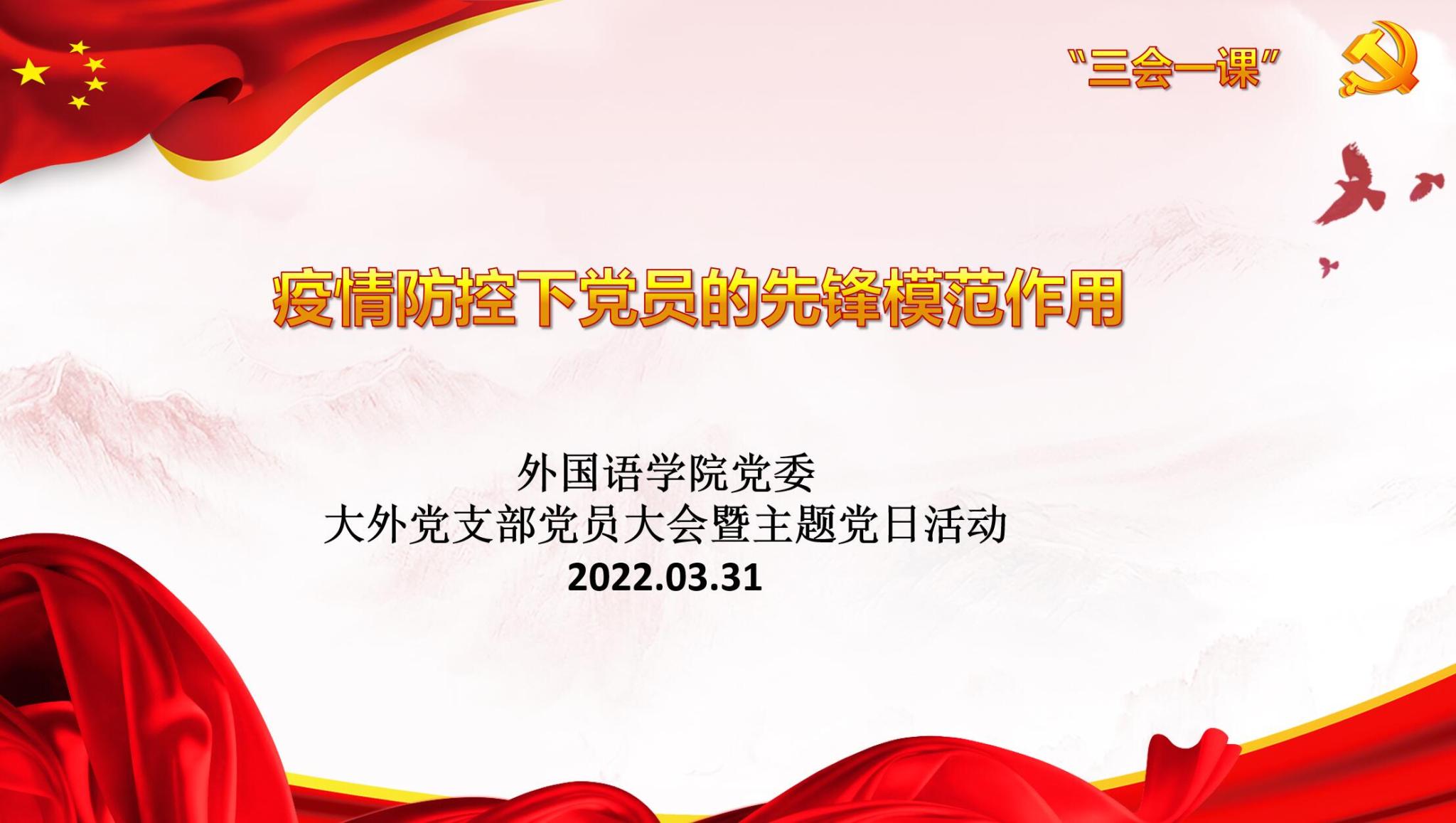 面对近期国内疫情防控再次呈现复杂严峻的态势,2022年3月31日晚19:20-20:45,英国正版365首页党委大外部党支部通过腾讯会议形式组织了一场主题为“疫情防控形势下党员的先锋模范作用”的全体党员大会暨主题党日活动。大外党支部除了在海外孔院工作的两位党员外,其余23位党员全部参加了本次活动。英国正版365首页党委书记岳希亮和组织员兼人事干事李宁宁老师应邀参加了本次会议。会议由大外党支部书记杨金蕊主持。