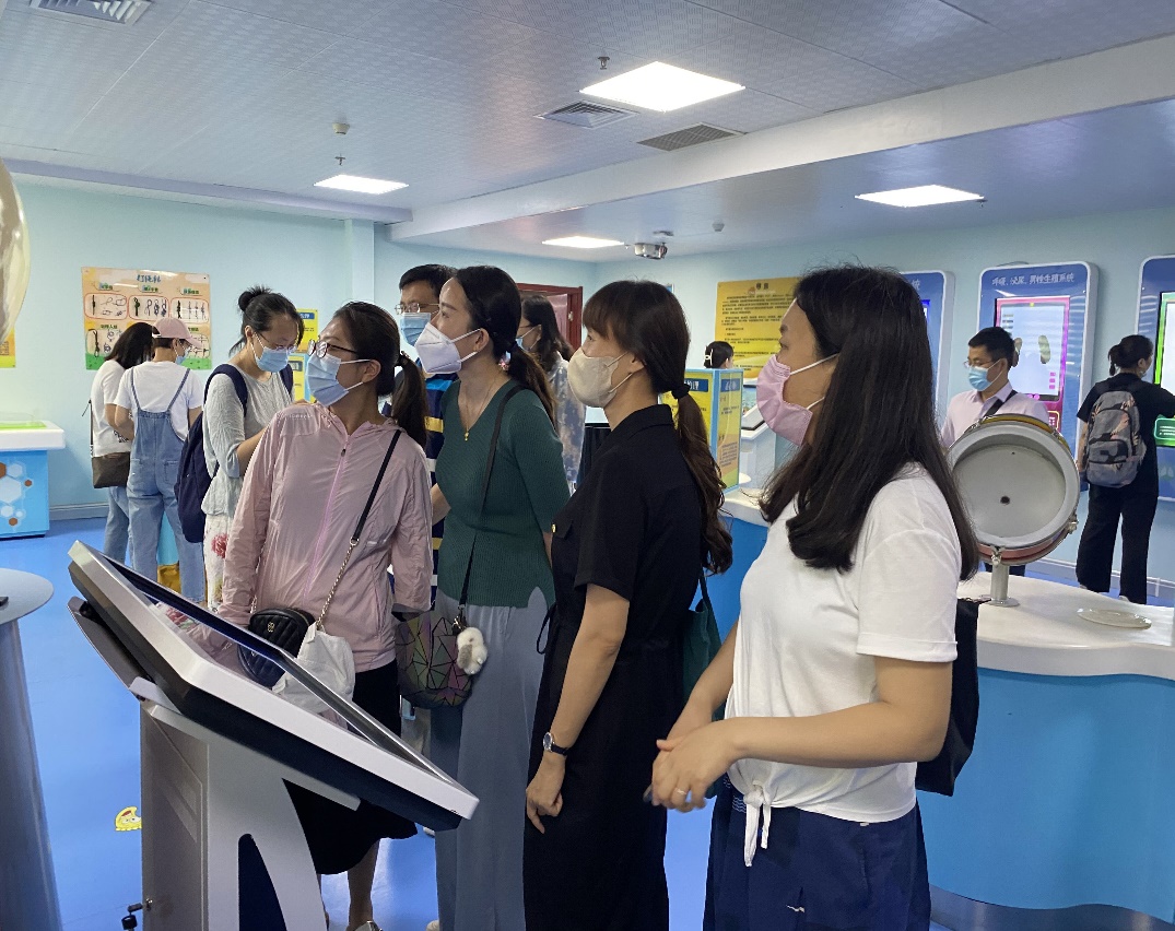 随后,在潘主任陪同下,居委会孔莹主任带领大家走进党建活动中心的二层和三层楼,实地参观了一校(社区党校)、二院(将校书画院、红色影院)、三馆(科普馆、图书馆、爱心馆)、四室(心理咨询室、VR体验室、电子阅览室、文体活动室)、五站(双拥工作站、党群服务站、红色教育活动站、人大工作站、青年志愿服务站)。在孔主任详细耐心的讲解下,党员教师们对社区党建工作有了非常全面、直观的了解,对社区党建网格、志愿者服务、惠老特色服务、青少年素质教育等社区综合治理和服务创新工作有了充分认识和感受,无不为文东街道的党建工作点赞,为和平路社区居民的归属感与幸福感感到羡慕与高兴。