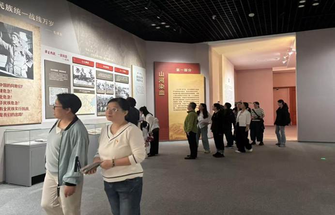 教师党员们在党支部书记韩冰的带领下有序进入展厅,循着 “山河染血—山河不屈—山河重整”的历史脉络,开启了一场沉浸式的红色研学之旅。