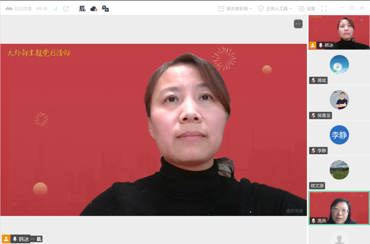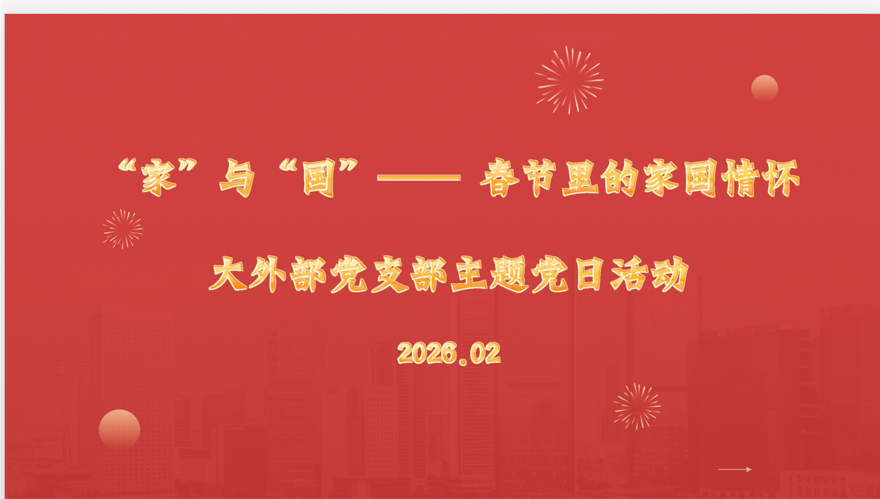 2026年2月9日上午,大外部党支部组织了一场以“‘家’与‘国’:春节里的家国情怀”为主题的线上主题党日活动。活动围绕春节习俗的变迁、亲情的维系以及家风建设展开深入讨论,与会党员结合亲身经历与教学实践,共同探讨如何在现代社会中传承文化根脉、凝聚家国情怀。