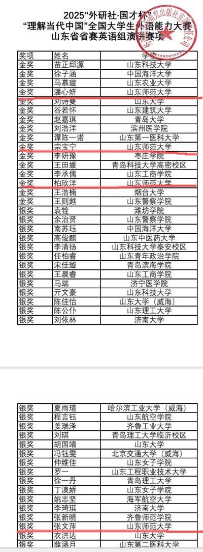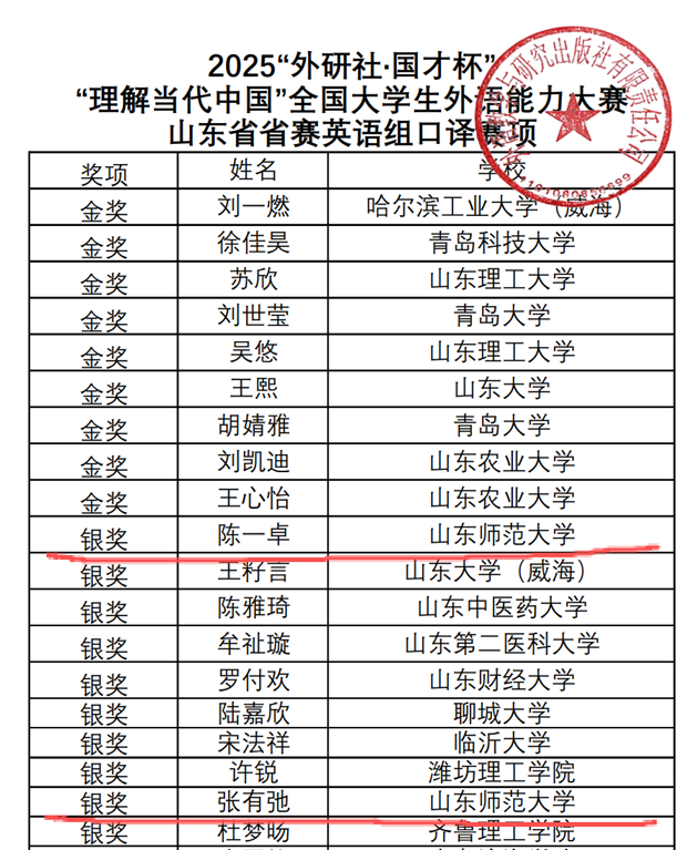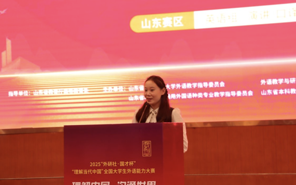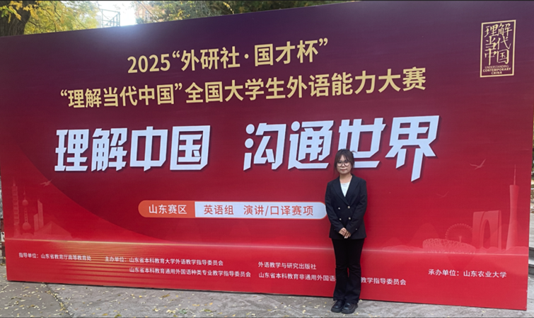 2025年11月1日-2日,2025“外研社·国才杯”“理解当代中国”全国大学生外语能力大赛山东赛区演讲赛项和口译赛项在山东农业大学落下帷幕。我校参赛选手凭借扎实的语言功底和过硬的知识素养,在激烈的竞争中再创佳绩:在英语演讲赛项获金奖三项、银奖一项,三名选手晋级国赛,在省属高校名列前茅;在英语口译赛项获银奖两项,取得突破性佳绩。