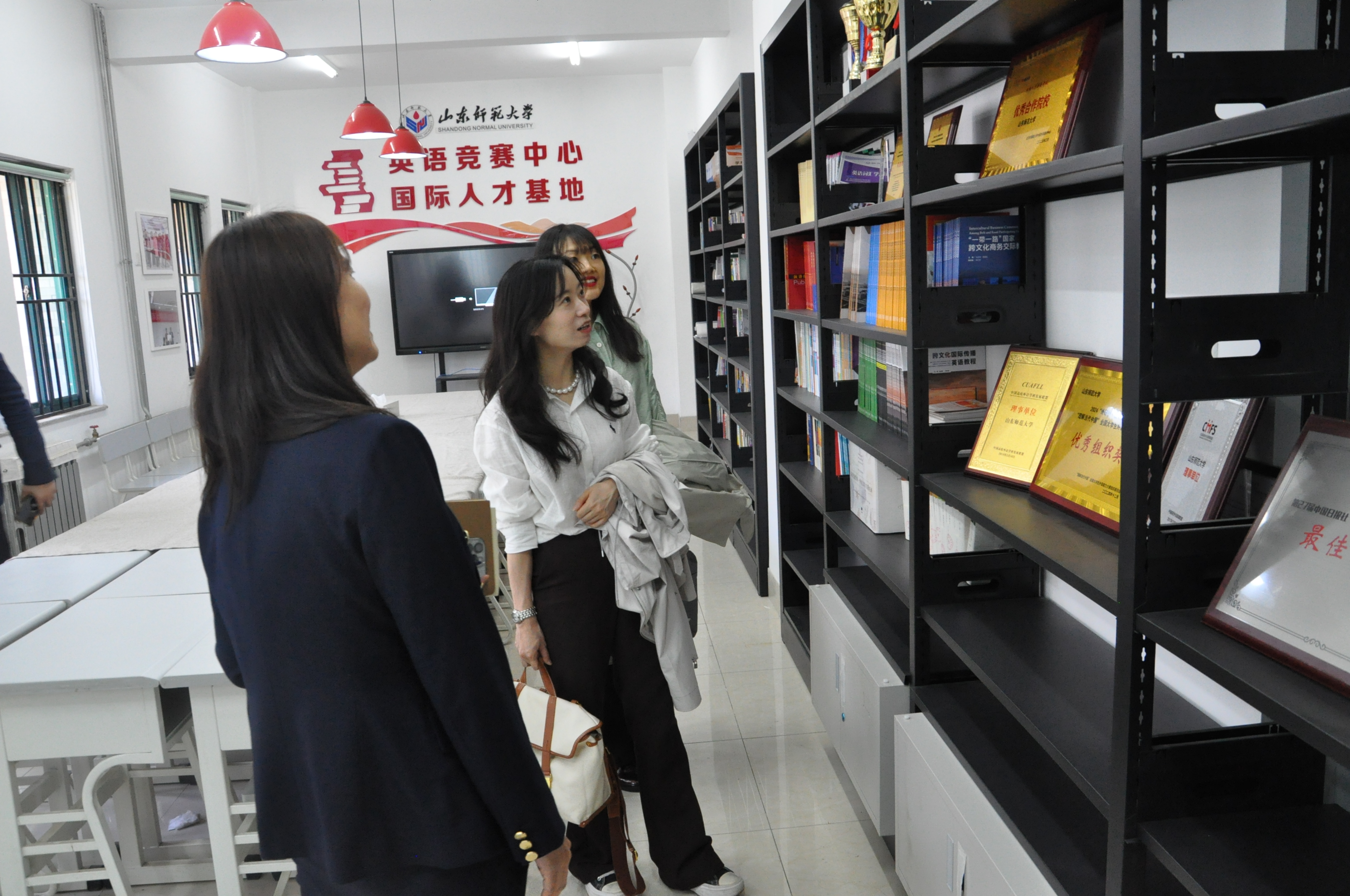 外研社国际人才发展中心冯总一行首先参观了我院英语竞赛中心暨国际人才基地活动中心,实地考察了学院为学生们搭建的良好的研讨、学习、模拟竞赛的环境以及近年来学院在国际人才培养方面的成果。