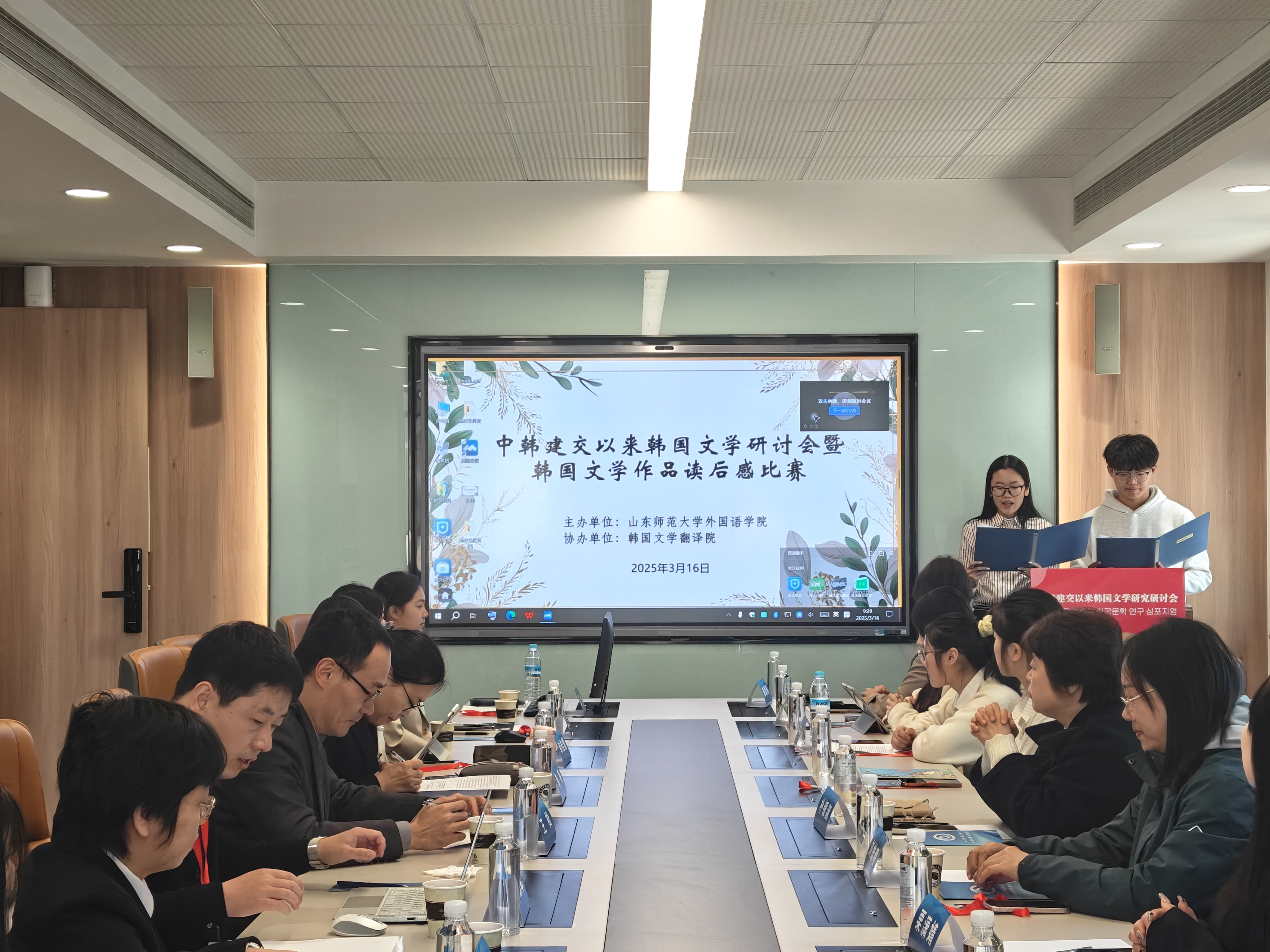 3月16日,英国正版365首页朝鲜语专业于文渊A413召开中韩建交以来韩国文学研讨会暨韩国文学作品读后感比赛。英国正版365首页党委书记王松,山东大学朝鲜语专业朴银淑教授,365(vip)英国上市朝鲜语专业韩晓副教授、李炳军老师,鲁东大学刘姝明老师,大连外国语大学韩佳慧老师出席本次会议,来自全国各地的15名读后感比赛选手参加会议,英国正版365首页朝鲜语专业学生刘思祺、栾以琳主持会议。