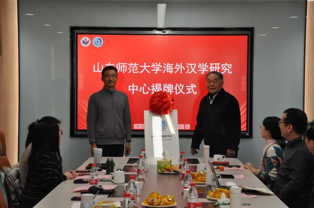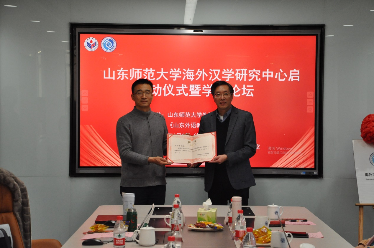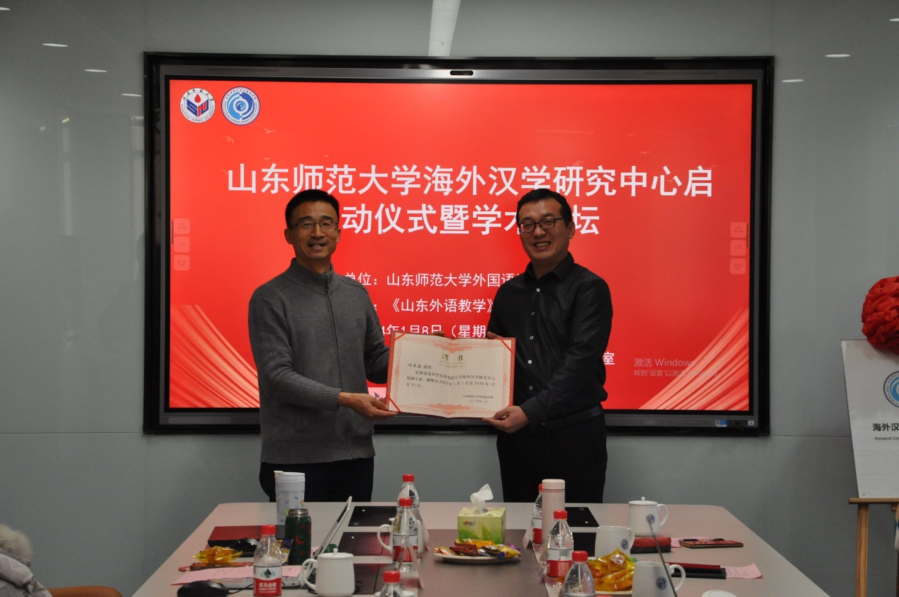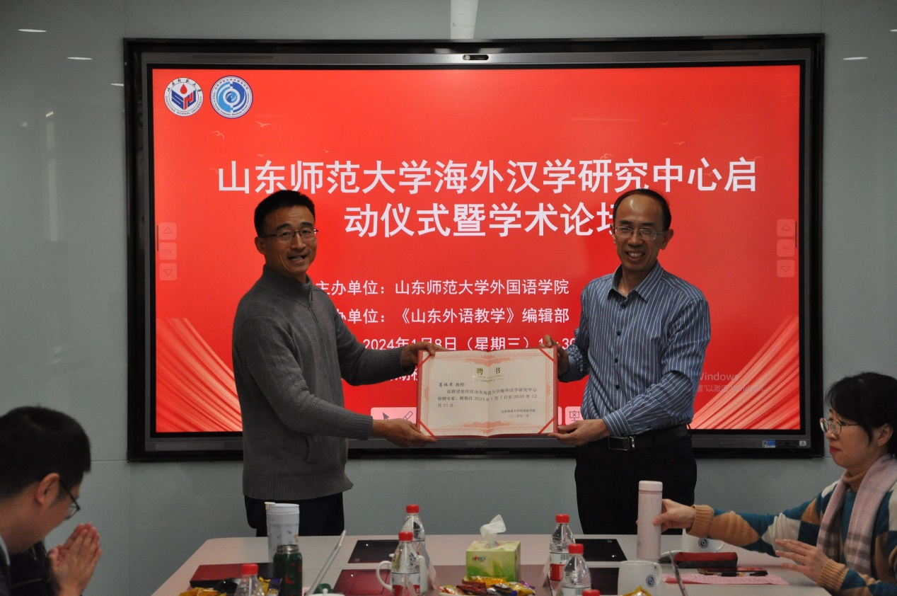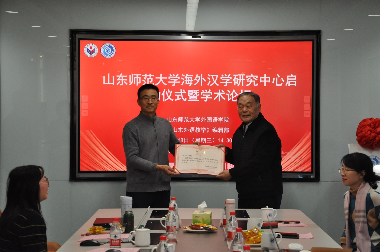 最后,在热烈的掌声中,高景海处长与山东大学郑杰文教授共同为365(vip)英国上市海外汉学研究中心揭牌,标志着该中心正式成立。高处长还逐一为与会专家颁发了特聘专家证书。