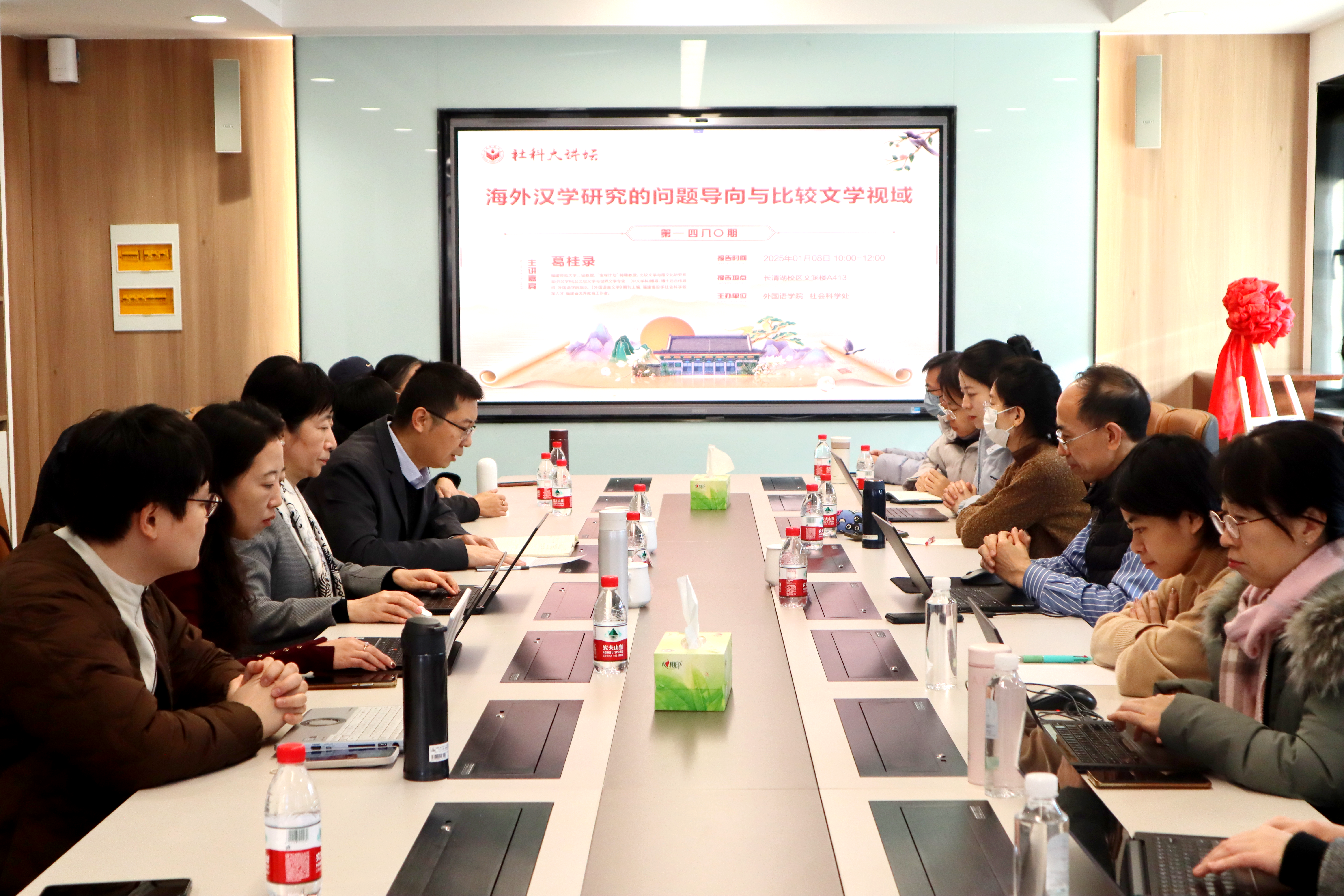 2025年1月8日上午,英国正版365首页成功举办社科大讲坛第1480期“海外汉学研究的问题导向与比较文学视域”。本次讲座邀请福建师范大学葛桂录教授作为主讲嘉宾,由英国正版365首页副院长翟乃海主持,英国正版365首页院长王卓总结。学院教师、研究生40余人出席了此次讲座。