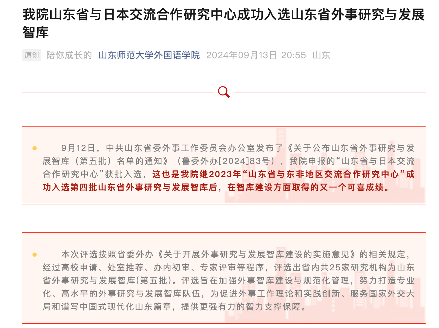 2024年9月12日,中共山东省委外事工作委员会办公室发布了《关于公布山东省外事研究与发展智库(第五批)名单的通知》,我院山东省与日本交流合作研究中心成功入选。这是继山东省与东非地区交流合作研究中心入选之后,我院获批的第二个山东省外事研究与发展智库。