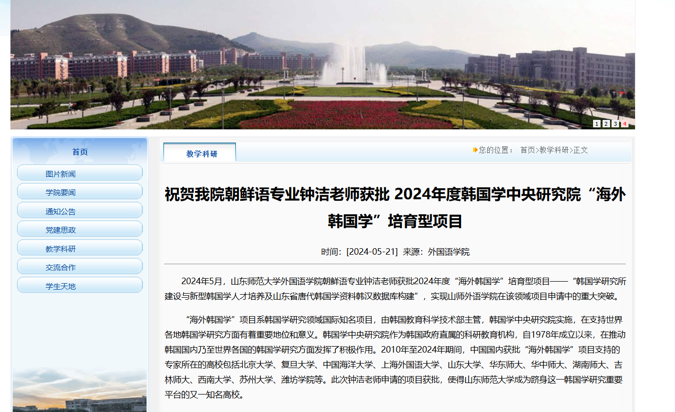 2024年,学院东方语系主任钟洁副教授的国际合作项目“‘韩国学’研究所的成立及新型韩国学专业人才培养及山东地方志出现的唐代韩国学资料的DB构建”获得海外韩国学培育型项目(Seed Program for Korean Studies)。韩晓副教授的“韩国藏书机构所藏汉籍调查”获得全球汉籍合璧工程调查委托类项目。李炳军老师获得韩国学中央研究院批准的海外韩国学项目及韩国文学翻译院批准的海外韩国文学研究项目各一项。