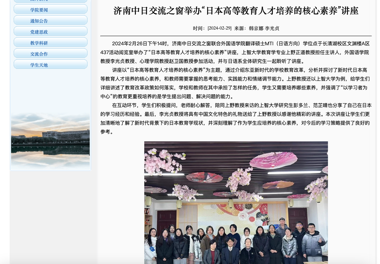 2024年2月26日,济南中日交流之窗联合我院翻译硕士MTI(日语方向)学位点邀请日本上智大学教育学专业上野正道教授以“日本高等教育人才培养的核心素养”为主题进行讲座。