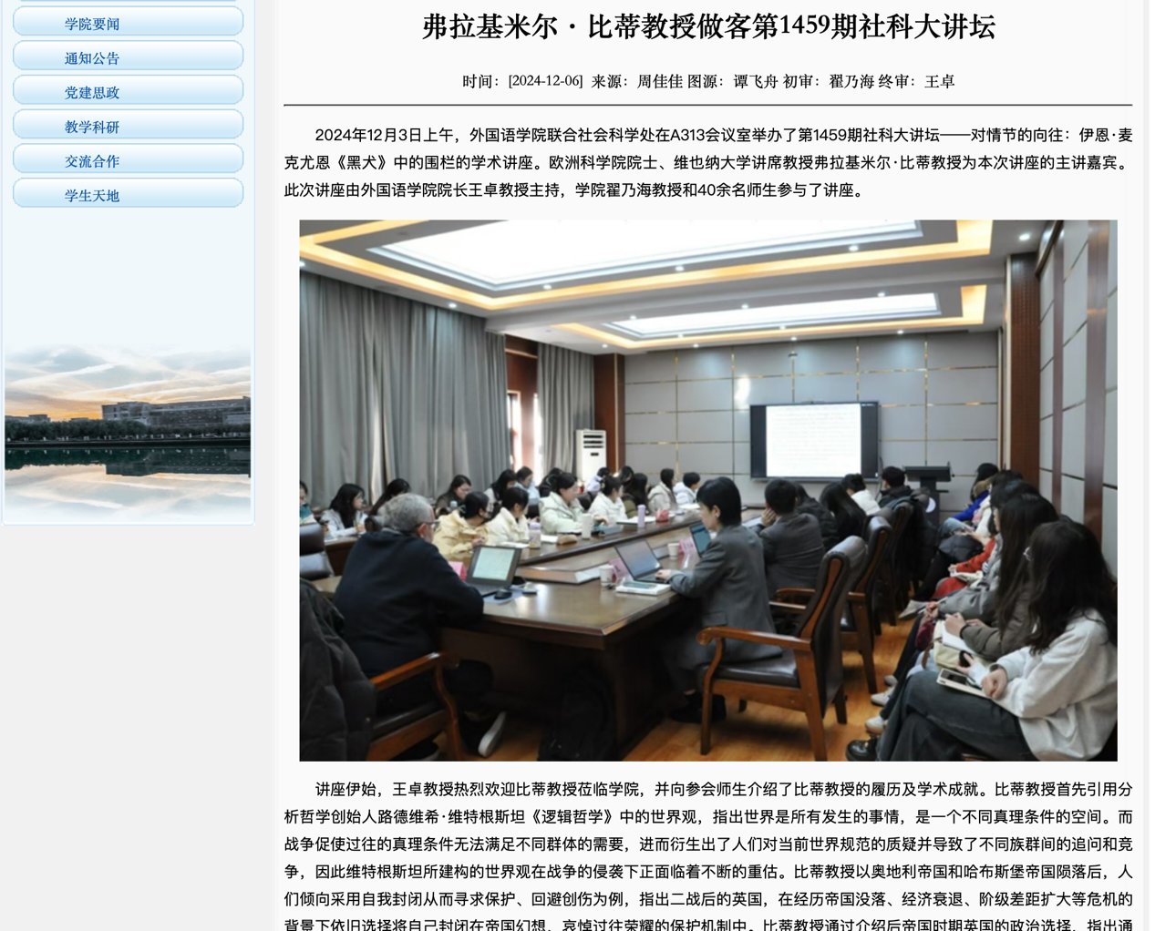 12月3日,我院携手社会科学处举办了第1459期社会科学大讲坛,主题为“对情节的向往:探析伊恩·麦克尤恩《黑犬》中的象征围栏”。本次讲座特邀欧洲科学院院士、维也纳大学讲席教授弗拉基米尔·比蒂教授(Prof. Vladimir Biti)莅临主讲。