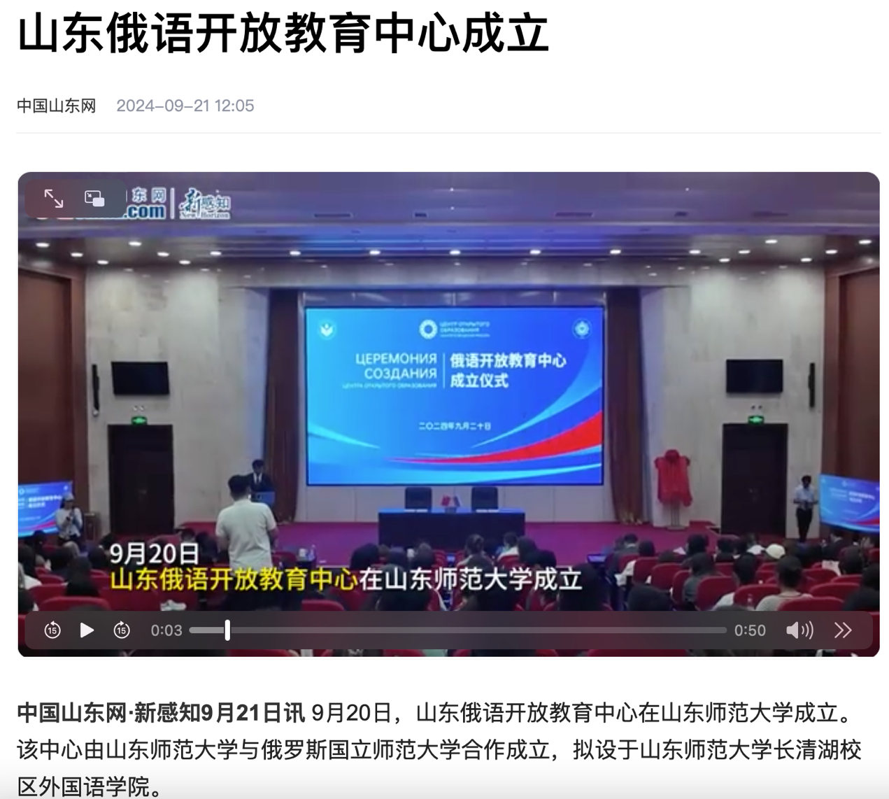 2024年9月中国山东网对俄语开放教育中心成立的报道