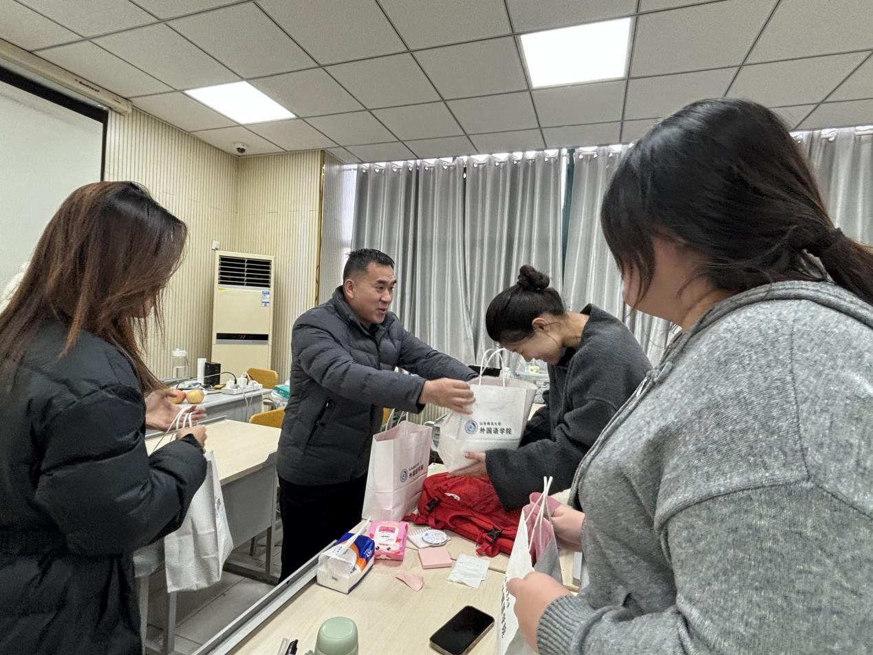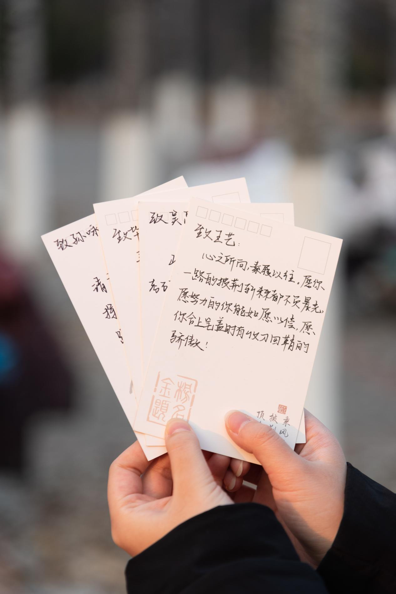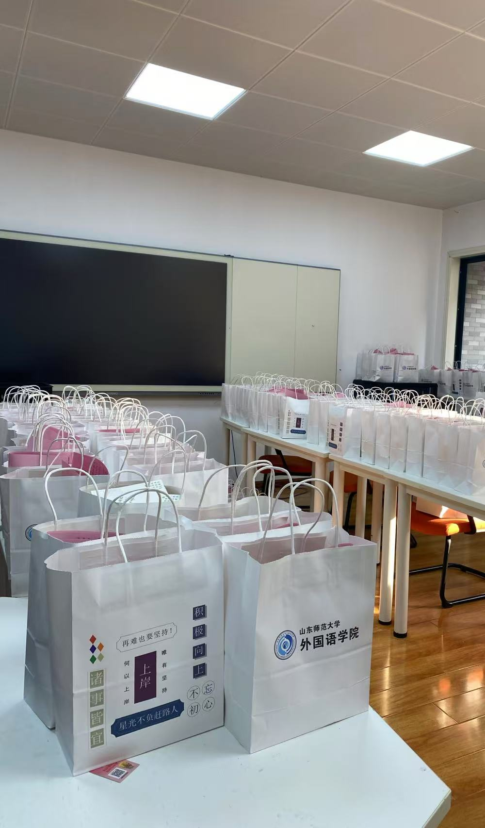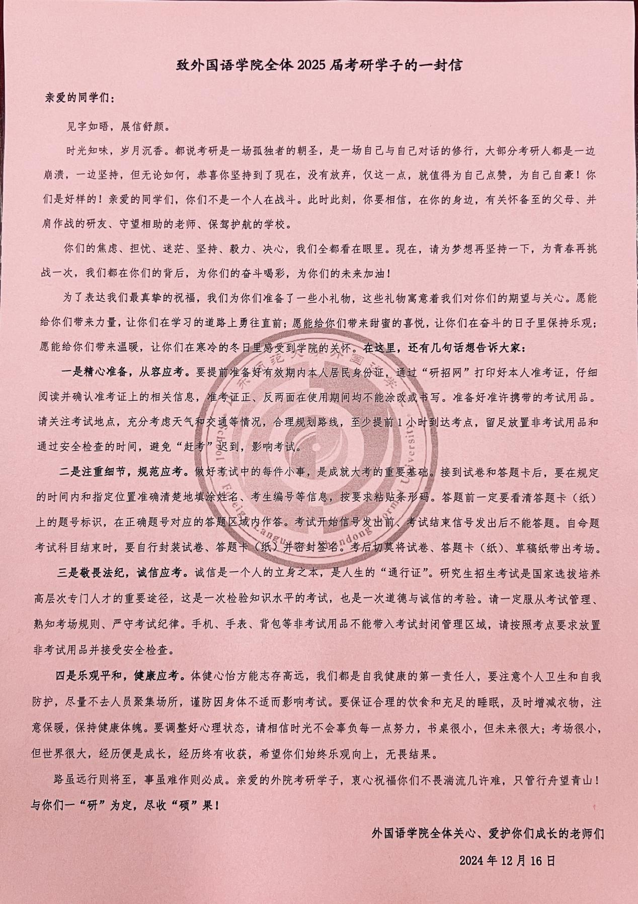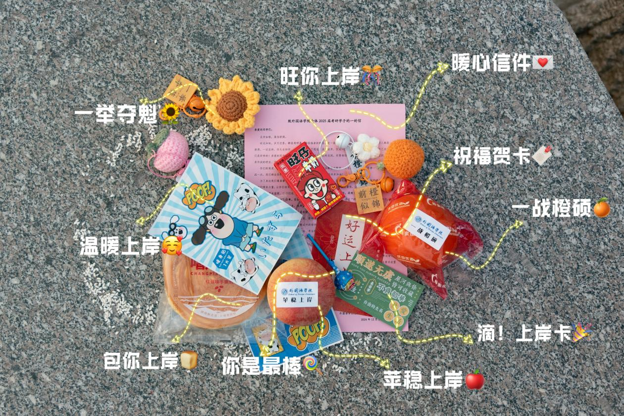 考研加油包内不仅有各类暖心小物品,还有老师们亲手写下的祝福信。“愿君勤勉不被负,考场焕光终登岸!”“信君卓异,学院永为君恃!” 一句句真挚的话语,饱含着老师对学生的深切期望与信任。