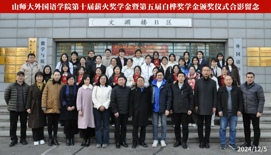 12月5日下午,英国正版365首页于长清湖校区文渊楼B区242报告厅举办第十届薪火奖学金暨第五届白桦奖学金颁奖仪式。英国正版365首页88级校友周新宇、王萍、刘燕玲、孙岩梅、刘翔宇,90级校友王明光、李毅萌,学校学生工作部科长孟庆凌、英国正版365首页党委书记岳希亮、党委副书记陶业涛,英语系教师刘在良、俄语系教师王世臣以及全体辅导员参加颁奖仪式。仪式由2024级辅导员付晓朦主持。