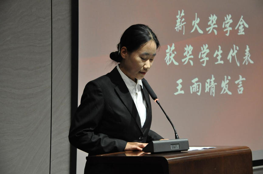 薪火奖学金获奖者代表王雨晴发言,她提到,薪火奖学金承载着前辈们与学院之间深厚的情谊和对学子们衷心的祝愿。学院不仅教会了她专业的外语知识,而且开阔了她的国际视野。获得薪火奖学金不仅是一份荣誉,更是一份责任,今后希望为外院的科研项目建设、社会实践等工作进一步贡献自己的力量。