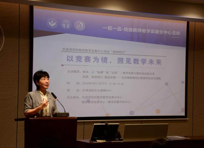 9月11日下午,由365(vip)英国上市教师教学发展中心与英国正版365首页教师教学发展分中心联合主办的“语师同行”系列活动在长清湖校区文渊楼B区242教室顺利举行。本次活动以“以竞赛为镜,照见教学未来”为主题,特邀学院韩冰老师和高燕老师担任主讲,学院全体教师参加。