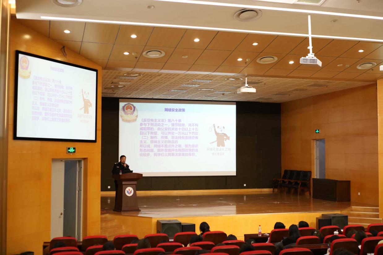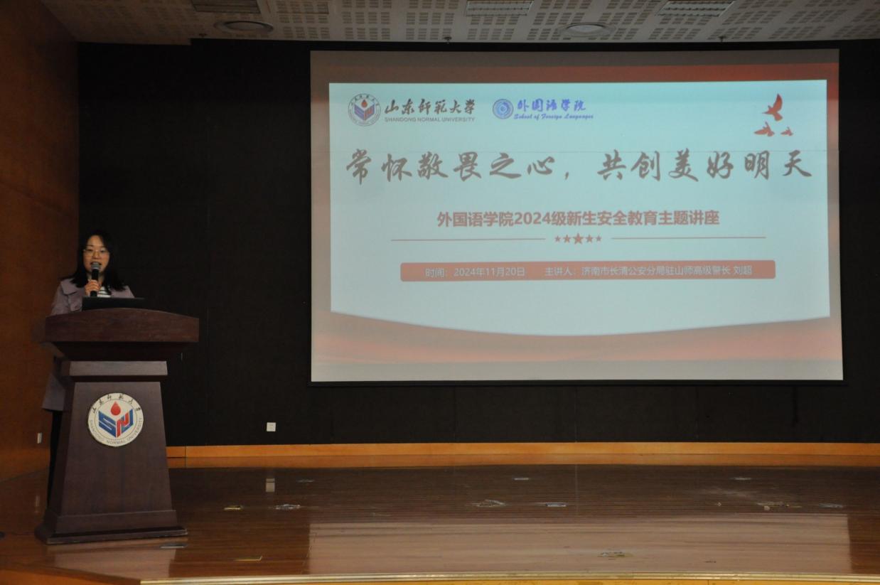 安全,是我们生活和学习的重要保障。为增强2024级新生的安全意识,提升自我保护能力,英国正版365首页于11 月 20日晚在图书馆负一层报告厅举办了一场别开生面的安全教育讲座。此次安全讲座特别邀请了济南市长清公安分局驻山师高级警官刘超为大家授课。英国正版365首页党委副书记陶业涛,2024级本科生辅导员付晓朦、李宁宁出席,2024级英国正版365首页全体新生参与本次讲座。
