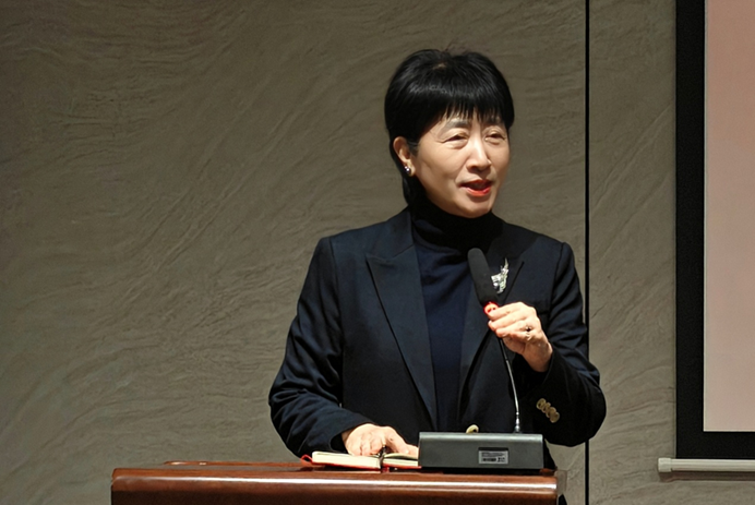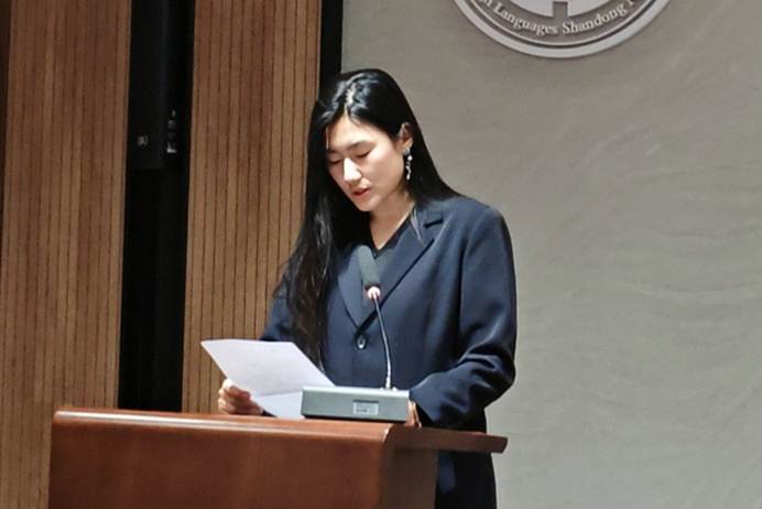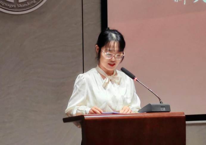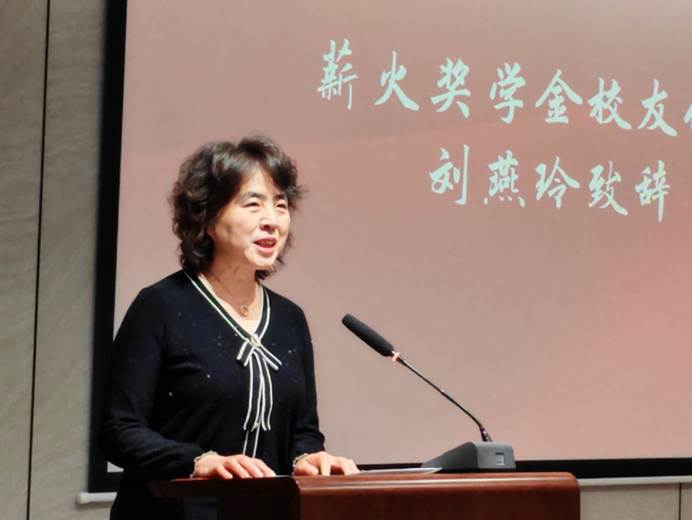 薪火奖学金校友代表刘艳玲校友致辞,她将校友们设立的薪火奖学金比喻为母校传递的"点点星火",既是荣誉,更是期许。她鼓励同学们在学习的道路上"行则将至",在山师大外院的沃土上奋发图强,将这份温暖的"薪火精神"传递下去。