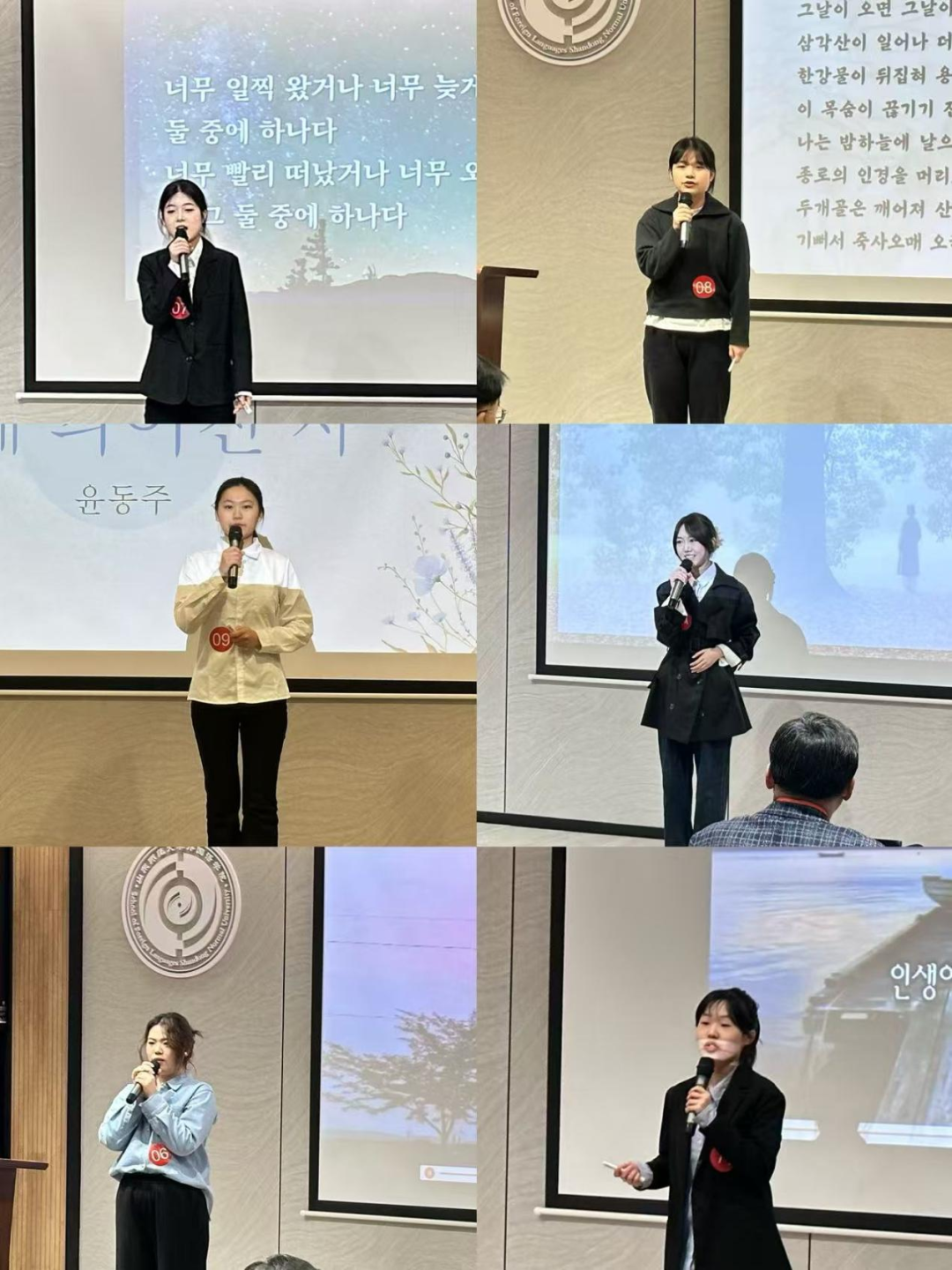 接着,主持人宣布比赛开始。来自不同高校的15名参赛选手满怀热情,凭借流利的韩语和富有感染力的朗诵,展现出扎实的语言功底和充满个性的舞台风格。他们将感情融入诗句,用声音传诵经典,让语言在抑扬顿挫里绽放出独特的艺术魅力,在朗诵中搭建起文化沟通新桥梁。