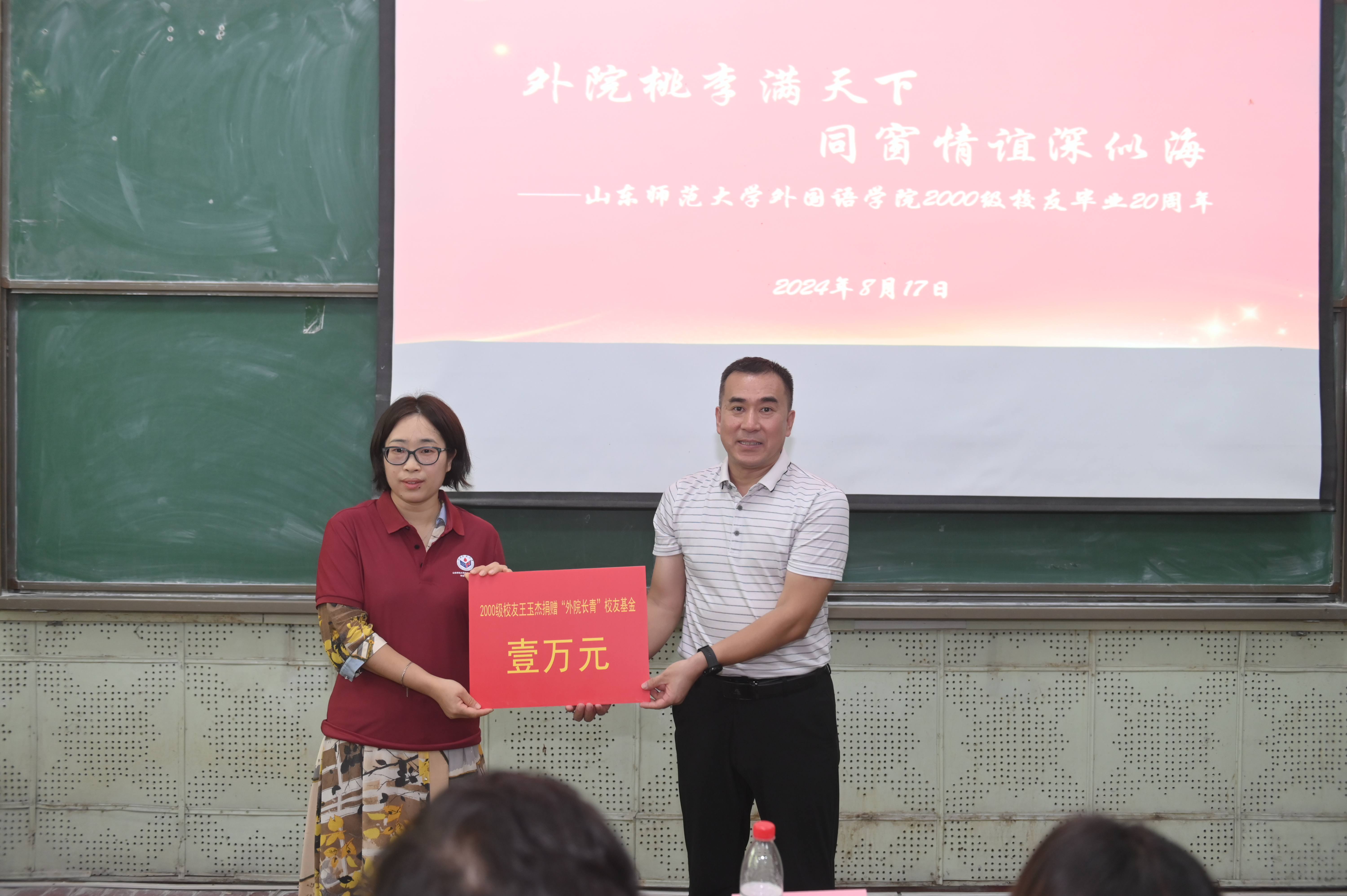 英国正版365首页党委副书记陶业涛代表学院接受2000校友王玉杰捐赠“外院长青”校友基金壹万元。