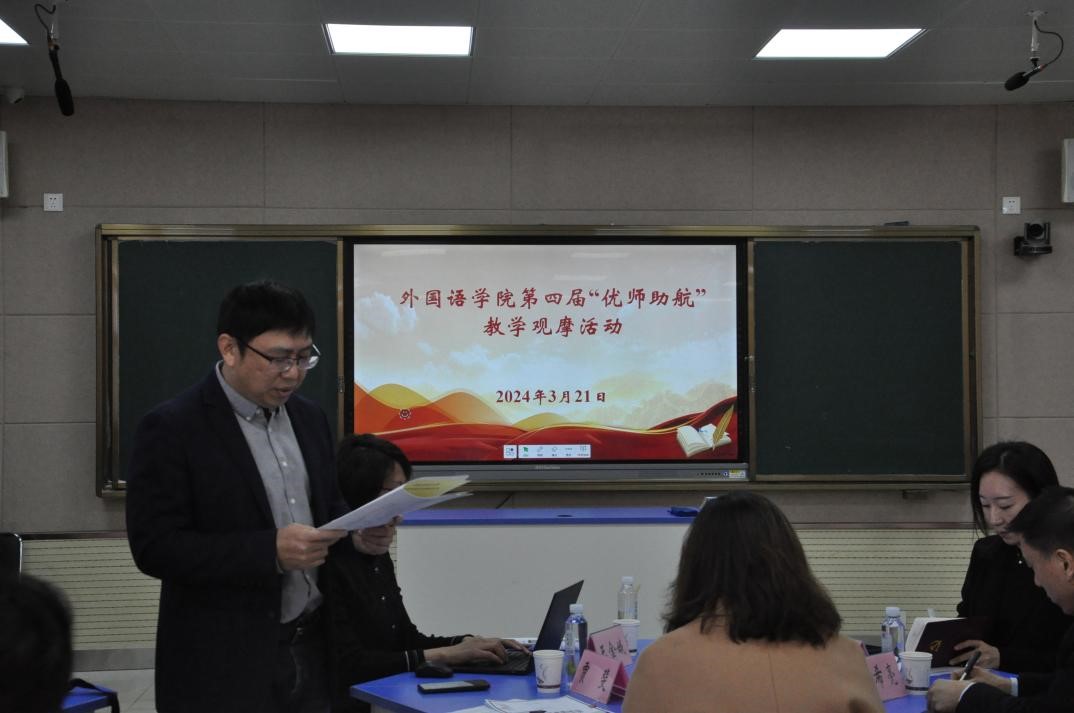贾斐主任首先肯定了高燕老师的付出,随后他点出在教学理念方面,高燕老师真正贯彻了以学生为中心的理念;在教学内容方面,真正做到了教材与书本内容的结合;在教学设计方面,真正调动了学生的课堂参与积极性;在教学技术方面,熟练运用了科技成果,进行了混合式教学;在教学思想方面,切实的将思政思想融入到了课堂中,充分体现了中国传统文化的文化精神。最后,他表达了对青年教师们的期望,希望他们能够在未来的教育事业中取得辉煌的成就。