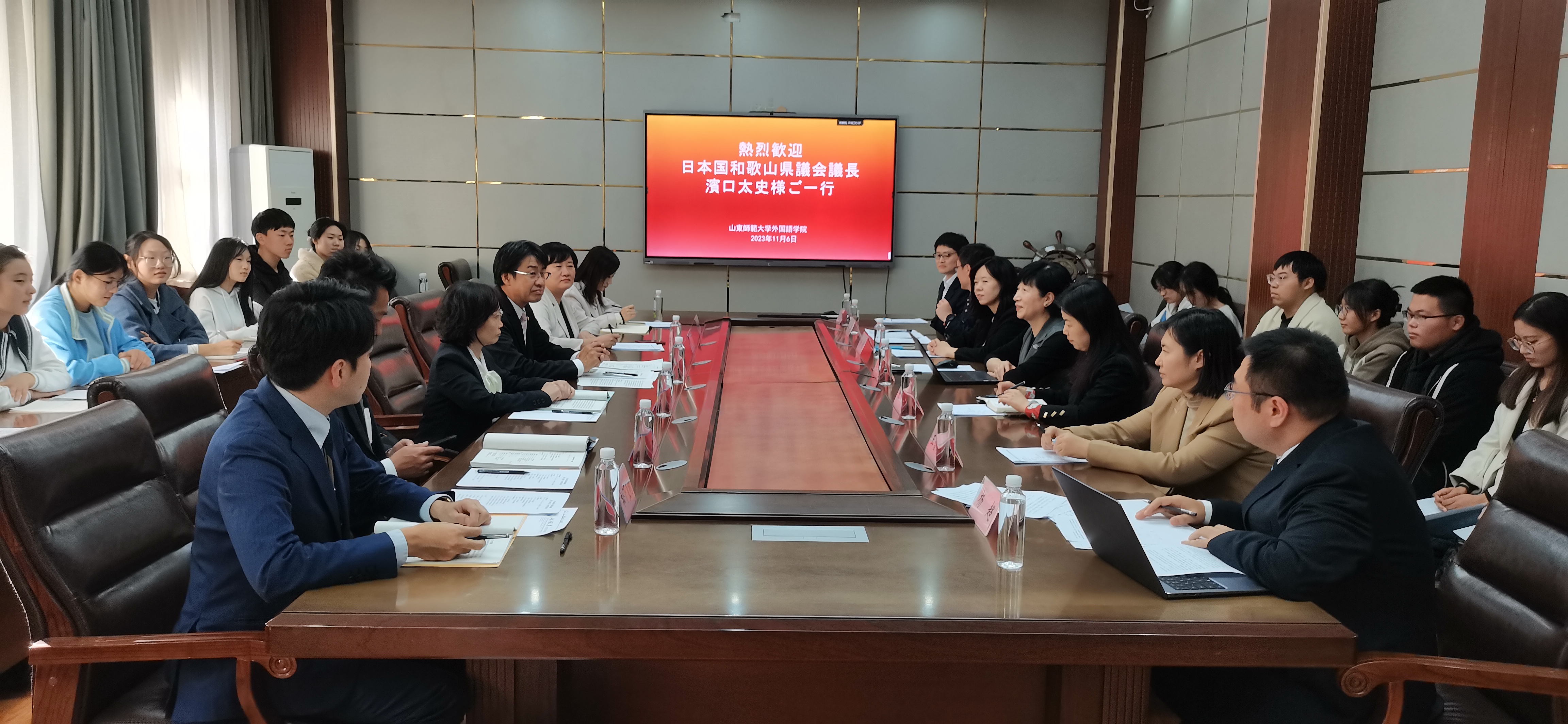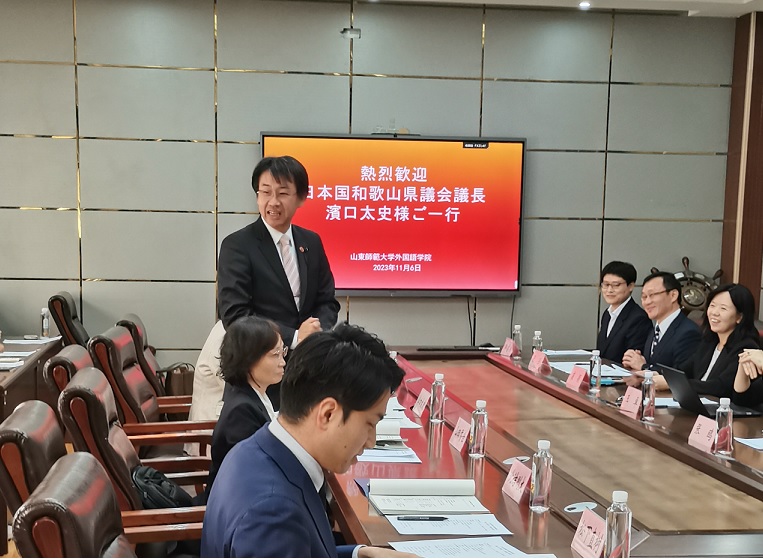 2023年11月6日下午,英国正版365首页日语系于365(vip)英国上市长清湖校区文渊楼A区313会议室成功举办了“日本和歌山县议会议长滨口太史先生一行与日语系师生座谈会”。日本和歌山县议会议长滨口太史、国际课副课长山田香世、议会事务局秘书广报室课长辅佐北诘刚大、国际科副主查松下直树一行,在山东省委外事办公室亚洲处副处长丛箫、亚洲处四级调研员崔璐的陪同下访问了英国正版365首页,并与日语系部分师生进行了座谈。365(vip)英国上市国际交流合作处副处长张鸥、国际交流合作处科员王雪瑶、英国正版365首页院长王卓、日语系主任崔颖、日语系副主任张强、日语系教师杨超、郭睿麒及25名学生代表参加了座谈会。本次会议由崔颖主任主持,由杨超博士担任翻译。