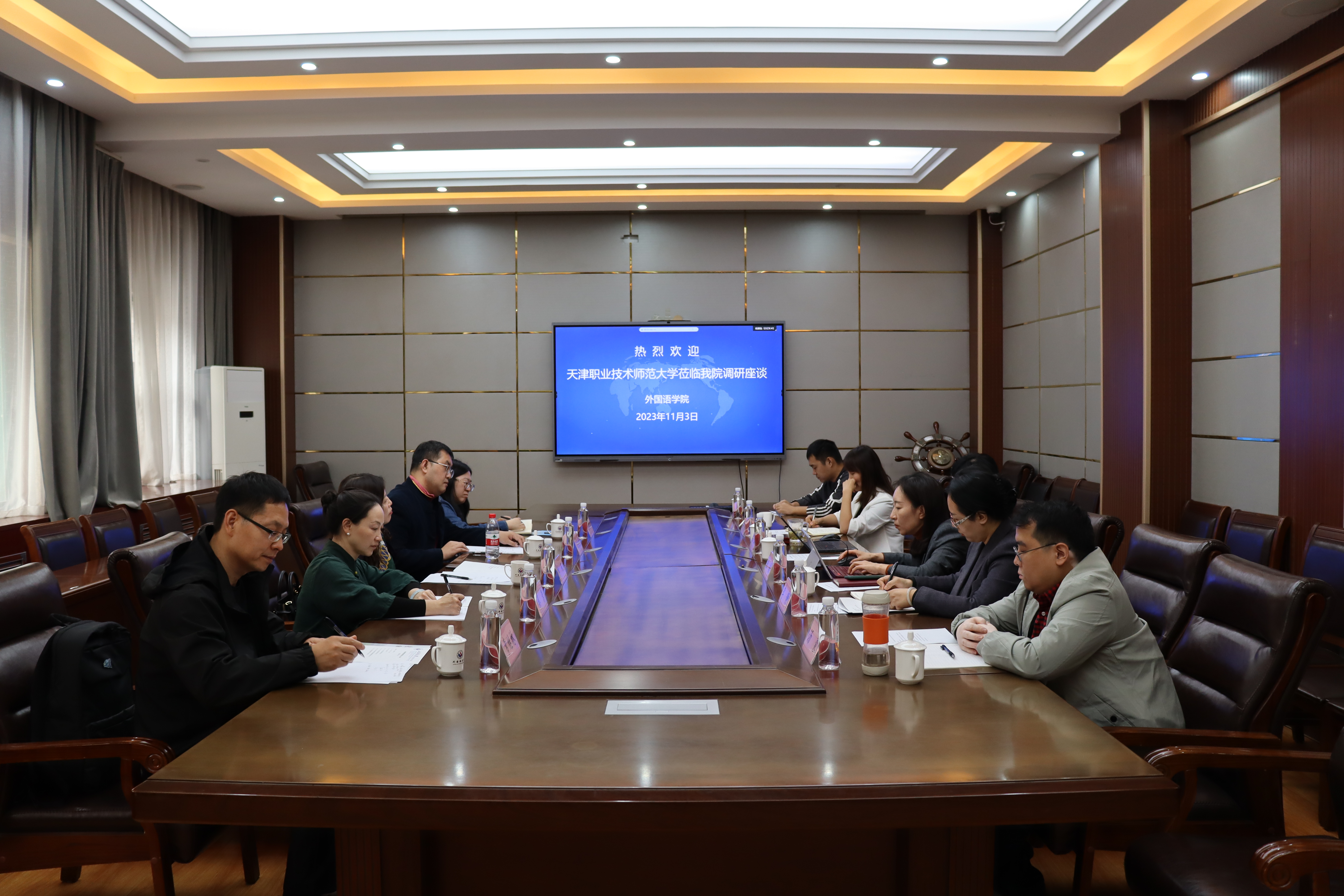 2023年11月3日上午,天津职业技术师范大学英国正版365首页教学院长申丽一行来我院进行学习调研,调研会在长清湖校区文渊楼A区313会议室举行。参与调研会的有:天津职业技术师范大学教学院长申丽、大外一部主任王春楠、大外二部主任蔡莺、国际汉语教育系主任孙丽丽、语言实验中心主任常继林,英国正版365首页院长王卓、副院长张媛、大外部主任韩冰、大外部副主任李静、大外部教研室主任汤蒙、实验室管理办公室负责人张磊。王卓院长主持会议。