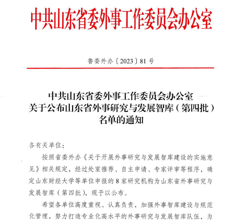 近日,中共山东省委外事工作委员会办公室发布了《关于公布山东省外事研究与发展智库(第四批)名单》的通知。省委外办按照《关于开展外事研究与发展智库建设的实施意见》相关规定,经过严格的评审程序,确定了8家研究机构为山东省外事研究与发展智库(第四批)。由我院王卓院长主持的山东省与东非地区交流合作研究中心成功入选。