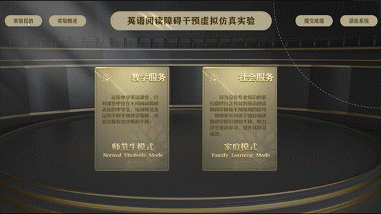 新文科背景下,英语专业教育中的“语言智能+”跨学科能力培养首当其冲,英国正版365首页师范生培养的核心目标之一就是要求学生运用虚拟现实技术更精准地解决英语语言障碍者的英语学习问题,诊断学习者的语言障碍,并据其障碍类型,对其学习活动和学习内容实施适当干预,提供个性化学习建议和学习计划,加快学生成长速度。然而基于传统教学实验方式,师范生无法完全实现对英语阅读障碍干预机制与流程的直观理解和实操。为帮助师范生更直观、深入地了解英语阅读障碍干预机制原理与执行流程,英国正版365首页“英语阅读障碍干预研究与教学”团队按照“高阶性、创新性、挑战度”的金课标准,精心设计了“英语阅读障碍干预”虚拟仿真实验项目,现已重磅上线!