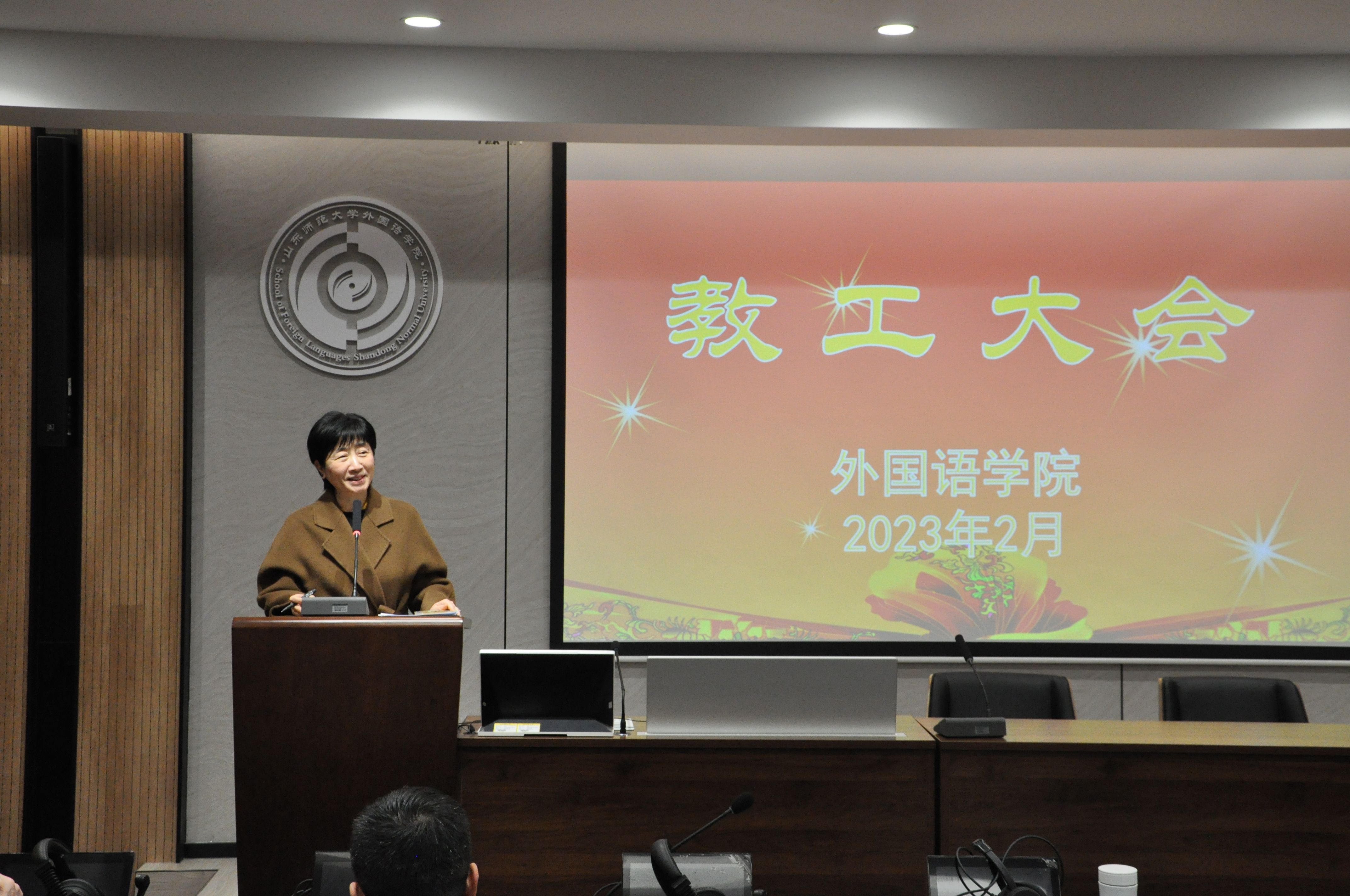 王卓院长首先对上学期工作进行了总结,肯定了学院在2022年取得的十大标志性成果。她指出,这十大标志性成果覆盖了教学、科研、社会服务各个方面,是2022年全院凝心聚力谋发展取得的重大成绩。2022年学院获得学校颁发的突出贡献奖,这一成绩离不开各位老师和同学的共同努力。接着王卓对假期工作的进展情况进行梳理总结,介绍了学院寒假执行完成“山东省职业院校教师素质提高计划国培项目”情况、承担的山东省研究生公共外语入学考试阅卷工作,二学位招生和授课等情况,感谢各位老师牺牲假期休息时间,出色完成各项工作。最后重点传达了曾庆良校长新学期工作部署要求,并结合学校2023年工作要点,提出要切实对标学校重点考核指标,全面提升核心竞争力、着力提高人才培养质量、不断深化教育评价改革、切实做好人才引培等工作,并结合学校的总体布局,部署了本学期学院的各项重要工作。