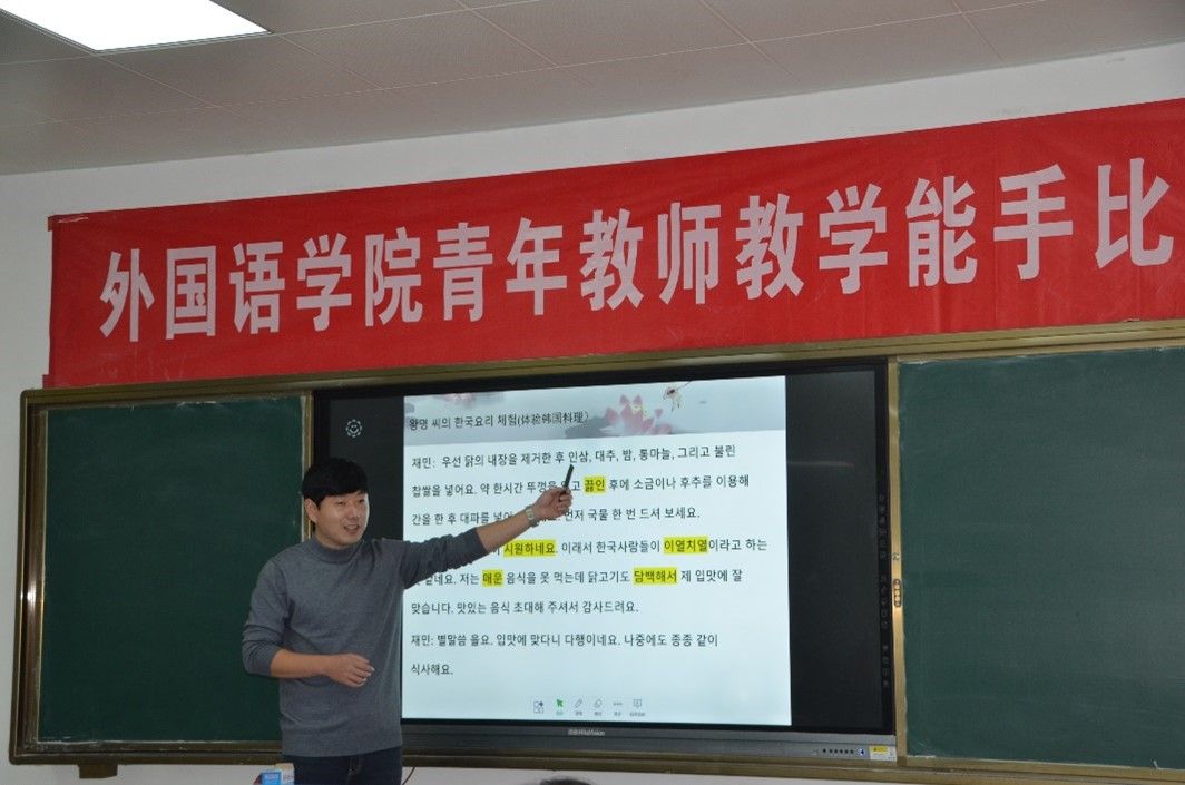 为进一步强化英国正版365首页青年教师教学基本功,促进其专业化发展,激发其教学激情与教学活力,为教师提供一个相互学习、相互交流、相互切磋的平台,提升教师的业务素质,英国正版365首页于11月22日下午在长清湖校区B540举办了学院青年教师教学能手比赛。此次院级比赛选手为来自英语、日语、朝鲜语专业的四位青年教师,学院陶业涛副院长、校级教学督导胡艳玲教授、院级教学督导组组长蒋斌副教授及各系部主任等出席此次活动。活动由王金娥副院长主持。