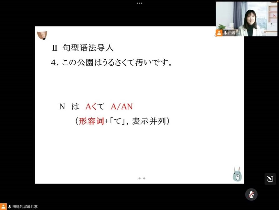 此次教学展示的主讲教师为日语专业青年教师田嫄博士,其主讲课程《基础日语1》重视培养学生学习日语的兴趣、夯实基础,帮助学生尽快入门、掌握日语表达的同时,注重提升学生的综合素养。田老师的授课紧扣预设教学目标,结合学生实际,为克服网络授课的局限性调动了多种信息技术手段进行新课知识讲授。授课内容充实,学生参与度很高,教学效果良好。