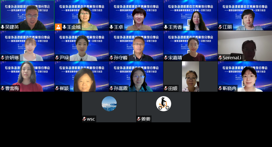 为贯彻教育部《高等学校课程思政建设指导纲要》、山东省教育厅《关于深入推进高等学校课程思政建设的实施意见》以及学校多次发布的有关深入推进课程思政建设文件和通知精神,全面推进专业外语课程思政建设,发挥好每门课程的思政育人作用,英国正版365首页于6月24日晚采用腾讯会议形式举办了“专业外语课程思政优秀案例分享会暨多语种课程思政工作室第一次研讨活动”。王卓院长、王金娥副院长,以及6个专业的系主任、部分骨干教师及新入职教师参加了此次活动。会议由王金娥副院长主持。