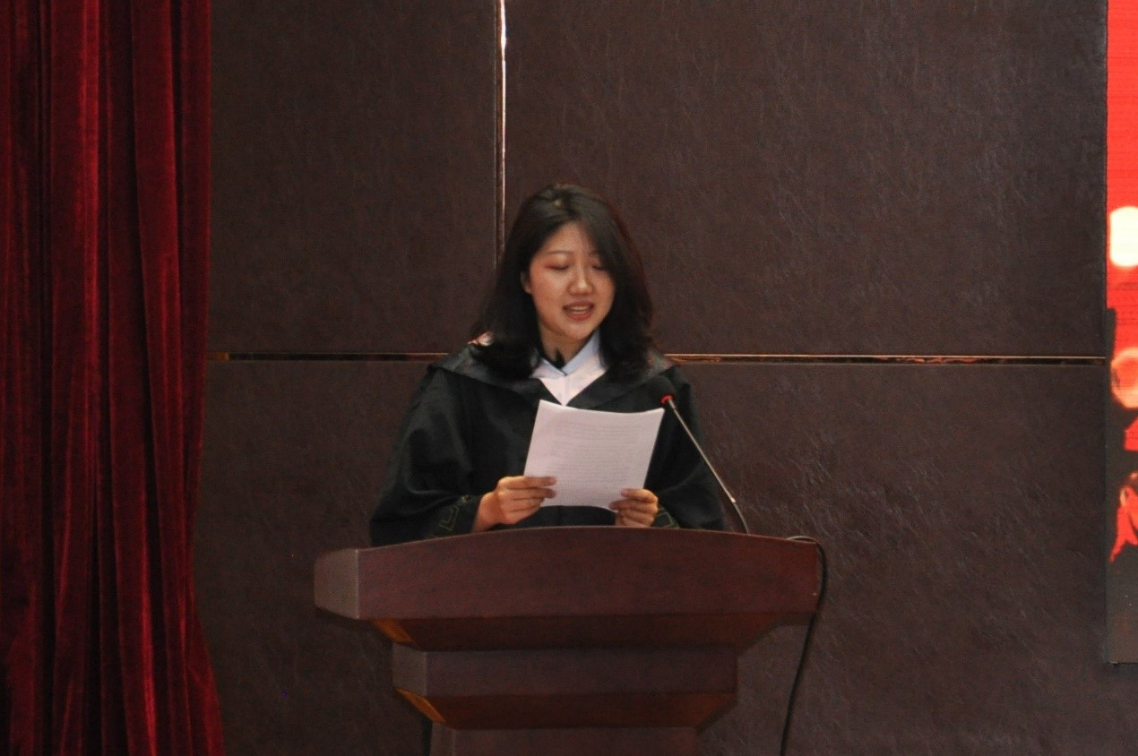 来自2018级英语专业的任牧琪代表2022届全体本科毕业生发言。她对塑就了自己四年美好时光的所有人表达了感谢:领导与老师们的栽培与教导,家长们的养育和支持,同学们的帮助和陪伴;她回顾了外语文化节,寒暑期社会实践,志愿服务活动等生活的片段,外院丰富的活动成就了更完美的自己;她鼓励大家树立远大的理想,无论继续学习深造亦或走向工作岗位,都要敢于争先,砥砺奋进,既为感念,亦是奉献。