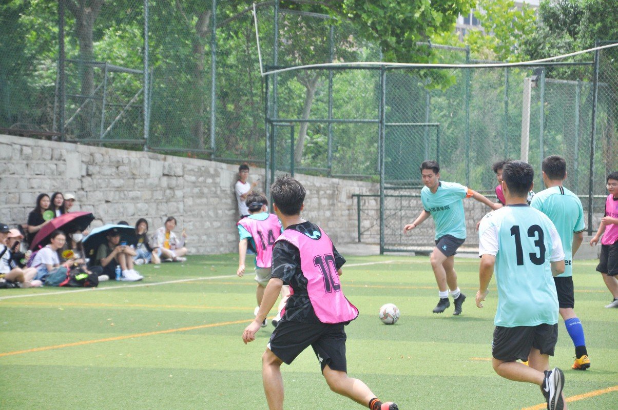 外院啦啦队的热场表演拉开了比赛序幕。橙白衣裙与绿茵蓝天相称,青春洋溢、活力四射。哨声响起,张京国副书记大力开球,宣告比赛正式开始。一边是由教师与17级队员组成的经验丰富的老将队,一边是由外院男足队18、19、20级队员组成的斗志昂扬的小将队。双方队员比赛前谈笑风生,一上场气氛陡然变化。头球、抽射、长传、变向过人、防守扑球、加速射门,丰盈着这场无与伦比的视觉盛宴。双方守门员马步扎稳,身体前倾,无惧创伤,只为全神贯注守好每一个球。绕过后卫、冲进禁区、猛脚射门,虽然小将们球技精湛,配合默契,仍难敌老将从容自若,找准时机和空位踢出的致命一击。最终老将队凭借明晰的战术思路与成熟的战术素养,以4:1获胜。