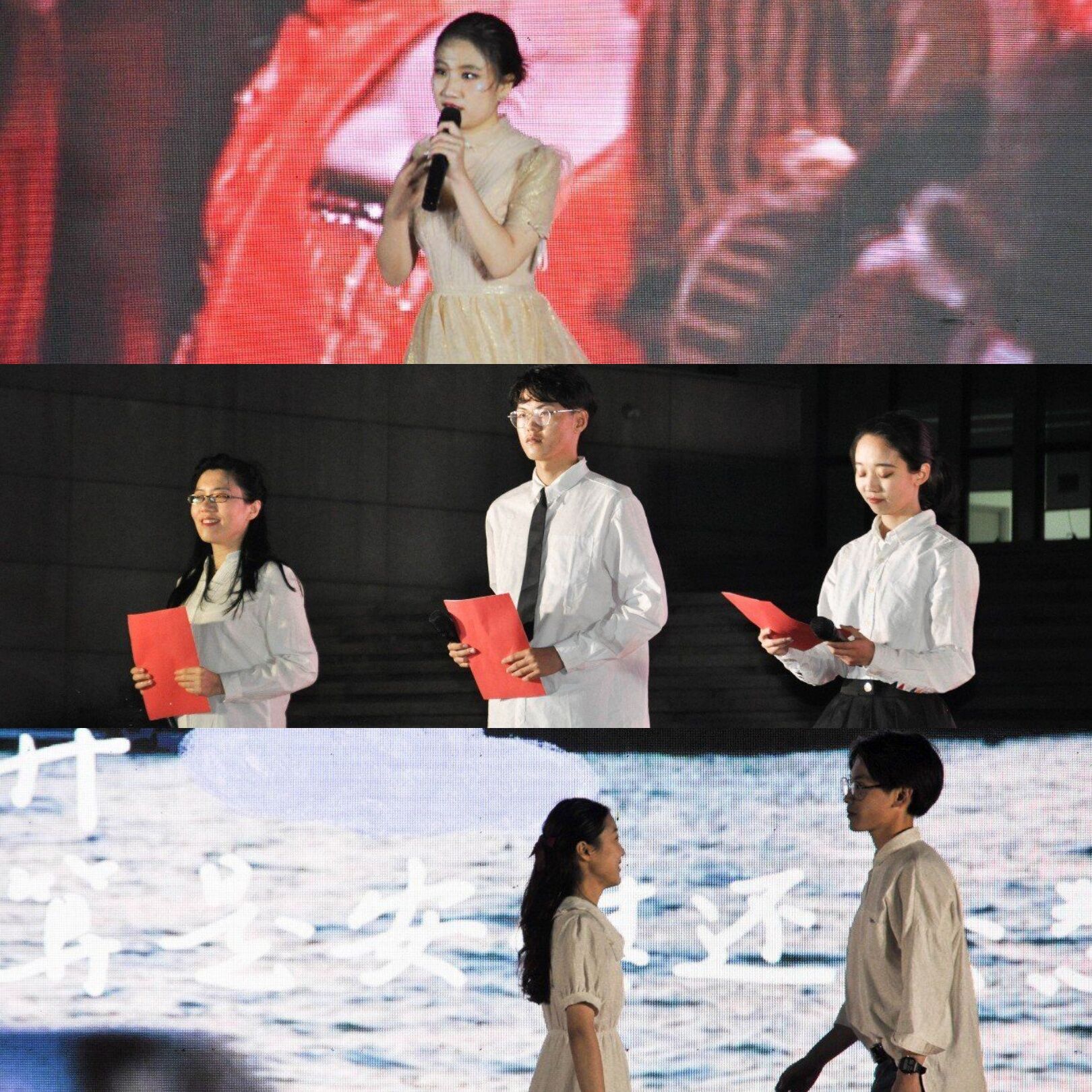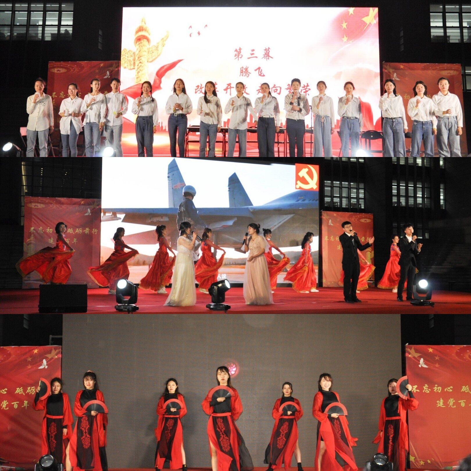 第二部分“腾飞”通过串联改革开放、香港回归等历史事件,展现中国国际地位逐渐提高,向着新世纪的黎明阔步向前的发展历程。诗朗诵《改革开放再出发》回望改革开放的宏图大业,激励青年学子以梦为马,为国奋斗;歌曲《七子之歌》带领大家回到港澳回归的历史时刻;由王卓院长领衔的外院教师合唱队共计三十余人,带来的歌曲联唱《同一首歌》与《我和我的祖国》雄浑壮丽,将拳拳爱国之情娓娓诉说;由教师代表刘焱和毕晓毅领读的师生朗诵《As I Began to Love Myself》传达出乐观豁达的人生态度;英文流行音乐演唱、吉他民谣弹唱、街舞与武术结合……各类节目异彩纷呈。流行与传统的交融,中西文化的碰撞展现了外院学子继往开来、开放包容的精神面貌。