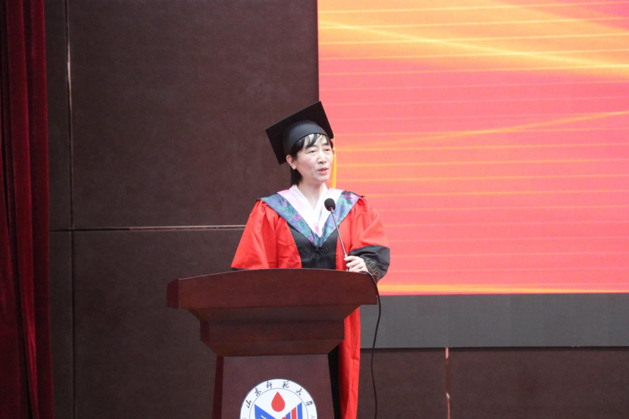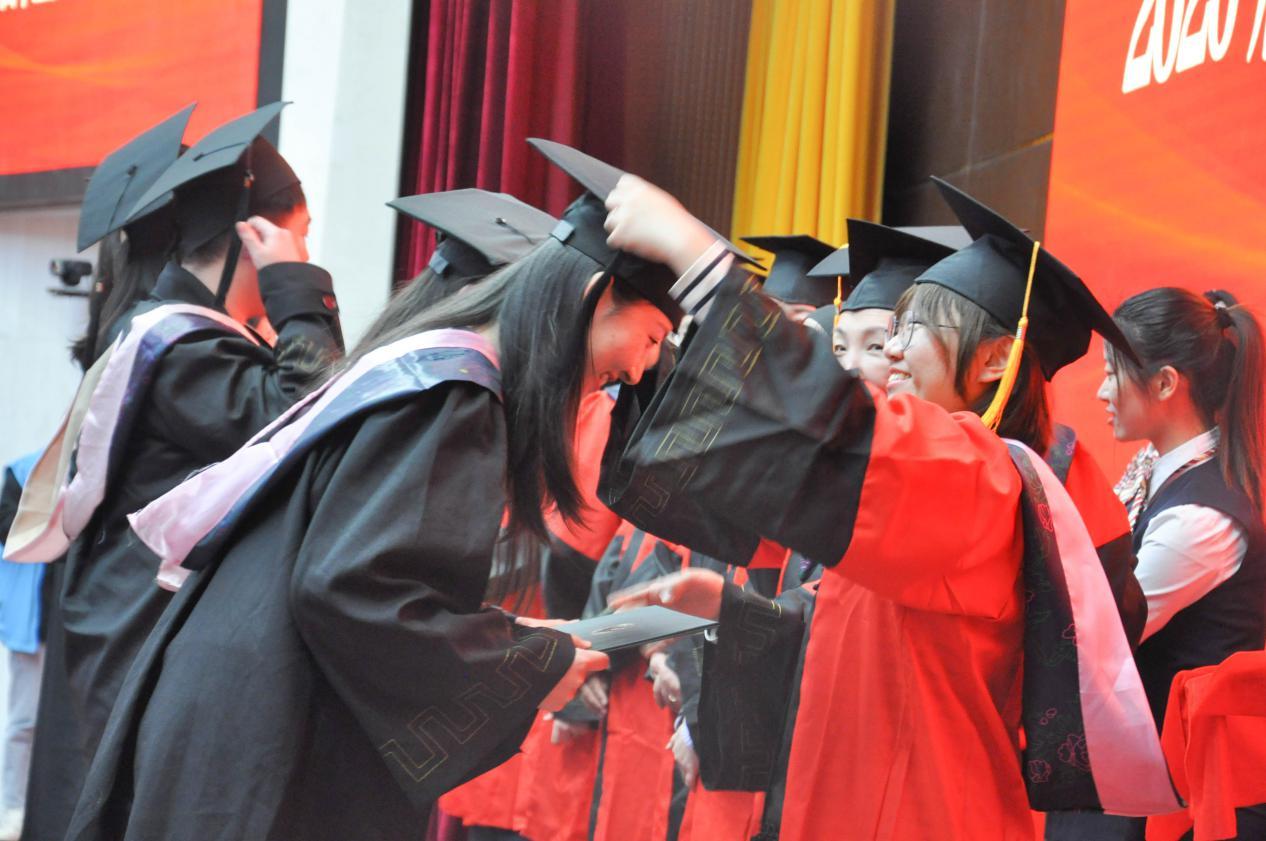 副院长王金娥宣读学校授予学位文件,随后,各系部教师代表为同学们拨穗正冠,象征毕业生已学有所成,可以展翅高飞。老师抚摸着同学学士帽上的帽穗,说不完的是内心无限的挂念与不舍,道不尽的是对展翅飞翔的毕业生的期许和自豪!