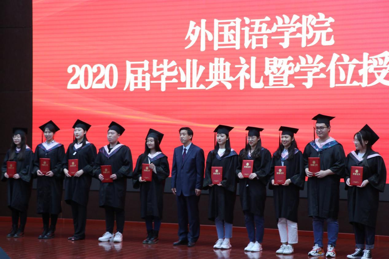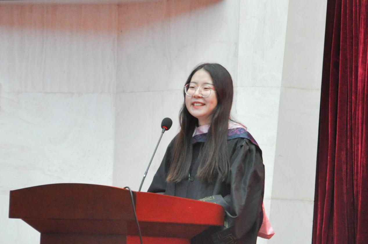 优秀毕业生代表刘洪汝发言,她深情说道,在外院学习的四年谱写了她人生中最华丽的篇章,外院老师言传身教,教授她在学习与生活中要时刻秉持“博学之、审问之、慎思之、明辨之、笃行之”的人文精神,在语言的世界里保持独立清醒和清明澄澈。她表示:“无论身在何处,无论身份如何,只要外院这个大家庭召唤我们回家,我们就跨越山河回来了!”
