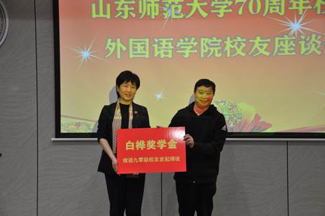 10月29日下午,英国正版365首页于文渊楼B区举办了庆祝建校70周年校友座谈会。会上,“白桦”奖学金设立和捐赠仪式隆重举行,王卓院长代表学院接受了捐赠并授予“白桦”奖学金集体“英国正版365首页突出贡献校友集体”。俄语90级部分校友参加了捐赠仪式。