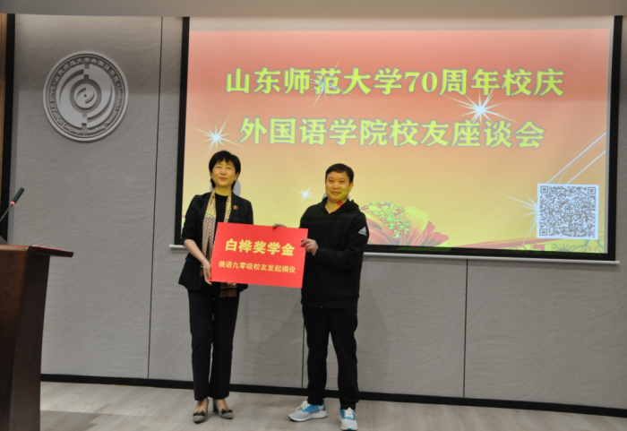 之后,白桦奖学金设立和捐赠仪式隆重举行。这是由90级俄语系校友发起设立的奖学金。即使毕业已有二十余年,他们依然心系母校的发展、心念学院的未来。在此仪式上,白桦奖学金捐赠代表,青岛泽瑞进出口有限公司总经理王明光先生致辞。他郑重阐述了奖学金的设立过程与深远意义,殷切鼓励学院师弟师妹们努力学习、成长成才。