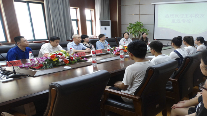 7月2日下午,英国正版365首页于综合教学楼A区会议室迎接日语系83级校友王军先生回母校交流座谈。英国正版365首页党委书记岳希亮、院长王卓、党委副书记金鹏、副院长胡艳玲、副院长岑玮、日语系主任李光贞及日语系教师张强、崔颖、郑玉贵出席了此次会议。2016级日语系17位学生代表也参与其中。