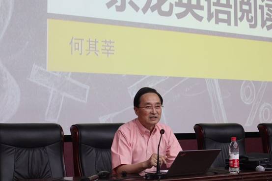 何其莘首先作了题为《英语教育思考:一条龙英语阅读》的讲座。讲座中,何其莘阐释了近年来对我国英语教育的深度思考,提出了“持久阅读”(readathon)的理念,主张遵循英语教育连贯性和阶段性规律,对我国英语学习者阅读习惯的养成和能力的训练进行“一条龙”设计,统筹规划,合理安排,使学习者从幼儿园阶段起直至大学,能够通过循序渐进、深入持恒的英语阅读,形成扎实的语言基本功和语言运用能力,最终实现终身阅读、终身学习的个人发展目标。
