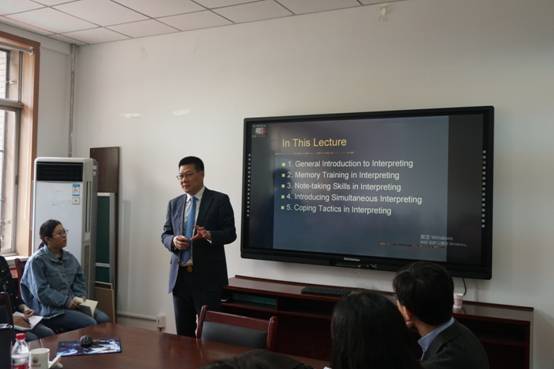 仲伟合教授还向我们简单介绍了同声传译。他指出了同声传译的六大原则,分别是顺句驱动、随时调整、适度超前、信息重组、合理简约和信息等值。仲教授还为我们讲解了同声传译的十大黄金法则,包括记住口译是为交流服务、合理运用相关设备、保证注意力的集中、不要过多关注生词、确保能够听清说话者和口译译员自己的声音、培养分散注意力的能力、尽可能使用简短的句式、保证语法正确、确保每句话的语义传达以及说完每一句话。之后,仲教授向我们介绍了口译的应对策略,他指出,口译的变数非常大,在现场有可能发生各种情况。有时,即便口译译员做了译前准备,也可能会出现跟不上说话者语速或难以准确翻译专业用语等情况。这时,译员应当采用简化、概括的策略,时刻记住口译是为了传达意思,不要拘泥于华丽的辞藻,而要专注于表达说话者的意思。如果简化和概括都不能应对这种情况,译员还应合理采用省略的策略,将某些不必要的信息去除,只还原主要信息。但是,这种策略是不得已之举,一定要慎用。