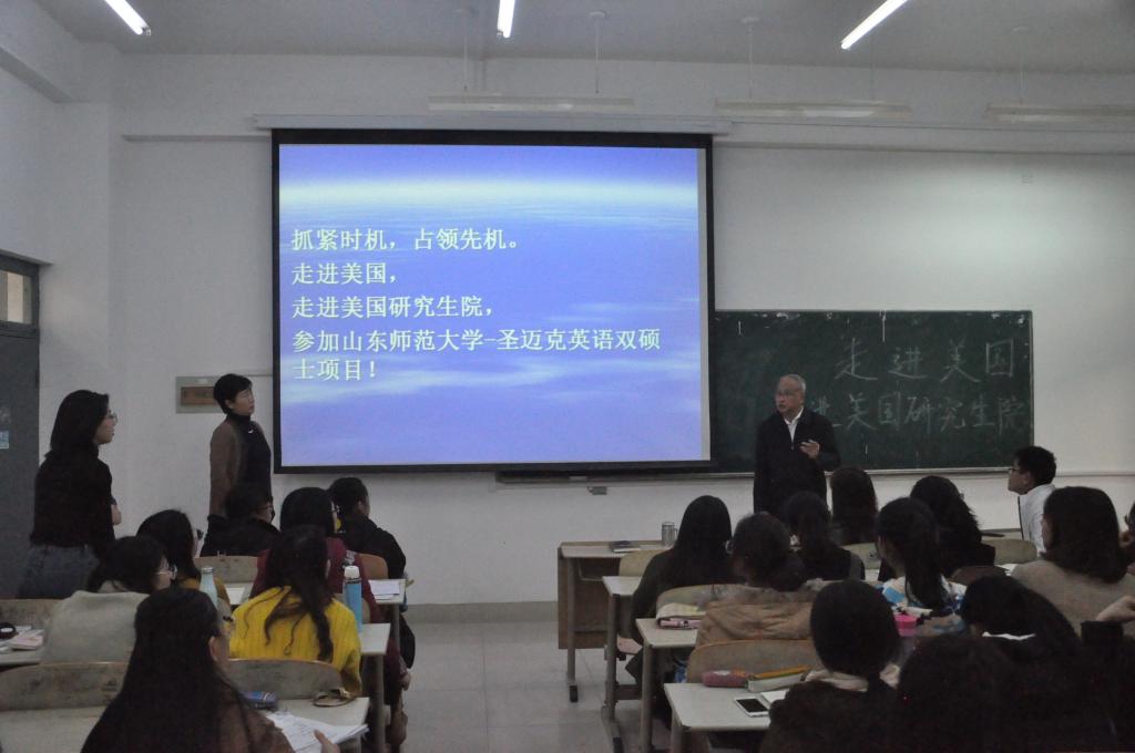 讲坛伊始,王卓院长向能在百忙之中做客讲坛的王觉非教授表示了感谢与欢迎,并对其进行了简单的介绍。在同学们热烈的掌声中,王觉非教授由此揭开了山东师大英国正版365首页与圣迈克学院联合培养的面纱。此次报告以漫谈的形式展开,大体由三部分组成。首先王教授向同学们展示了许多关于美国的照片,从华盛顿纪念碑到艾森豪威尔大厦,从抗议示威人群到无家可归的流浪者,从亚特兰大的夕阳无限好到夏威夷宁静的海滩,王教授从多视角为大家呈现了真实的美国点滴。透过照片,王教授耐心地为大家讲述着照片背后的故事,揭示美国的社会现象。王教授生动的讲解令同学们对美国的生活充满向往,带着这份憧憬,报告进入第二环节,王教授开始开始了对美国研究生院的介绍。王觉非教授对比了中美在大学与文理学院上观念的差异,中国民众普遍认为“大学”才是优质教育的象征,然而在美国,规模较小的文理学院往往因其精华式教育受到大家的青睐。与此同时,王教授提醒同学们国外申请研究生院最容易忽视的环节,并强调了实践经验、创新意识对文科学生的重要性。在第三个部分中,王觉非教授向研究生们介绍了我校与圣迈克学院双硕士学位项目内容及其特色,对大家关心的问题给予了详实的解答。最后王教授寄语同学们在此项目上要占领先机。