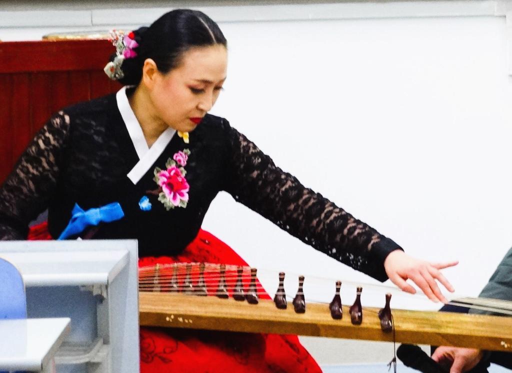 讲座伊始,权泰庆唱着《阿里郎》走进教室,与老师同学们亲切握手。在讲座中,权泰庆首先与大家分享了自己的艺术道路,她四岁开始学艺,为了得到艺术的真谛,经常到深山模仿大自然的声音,用伽倻琴与山鸟相和。然后权泰庆教授通过伽倻琴、长鼓以及韩国传统民谣盘索里,向大家介绍了韩国国乐的特点及其魅力,她介绍说, 国乐是指韩国民族固有的传统音乐,始于古代祭天仪式,是用伽倻琴、笛、长鼓、鼓等乐器演奏的韩国古典音乐,国乐演奏一般与韩国民谣盘索里演唱同时进行,演唱时注重现场与听众的互动,听众会不时伴以助兴和声。随后,她邀请学生上台击鼓伴奏,献唱韩国电视剧《大长今》主题曲,欢快的节奏将现场气氛推向高潮。最后,她邀请同学们一起演唱《月亮代表我的心》,表达自己对艺术以及对中国的热爱。