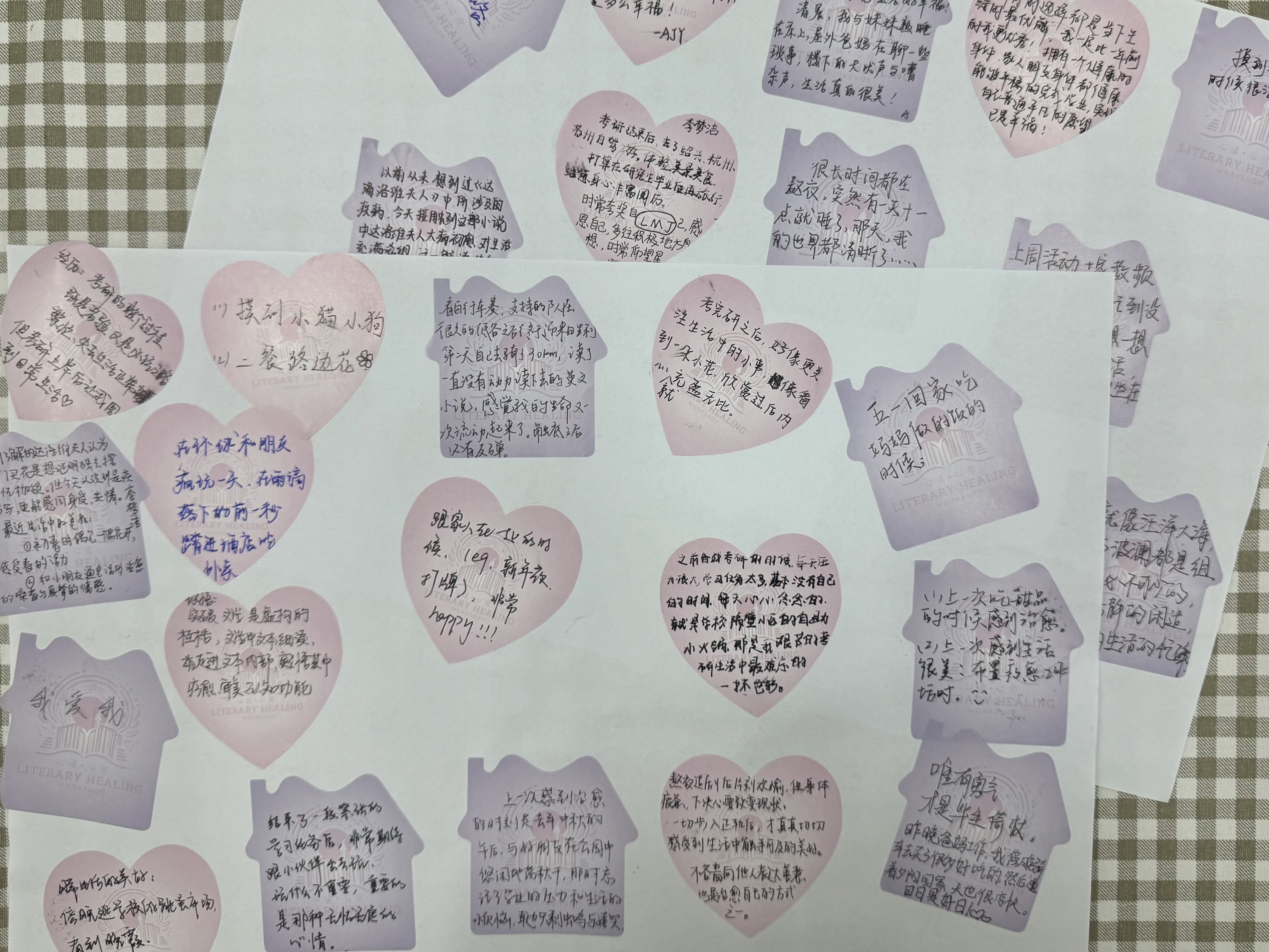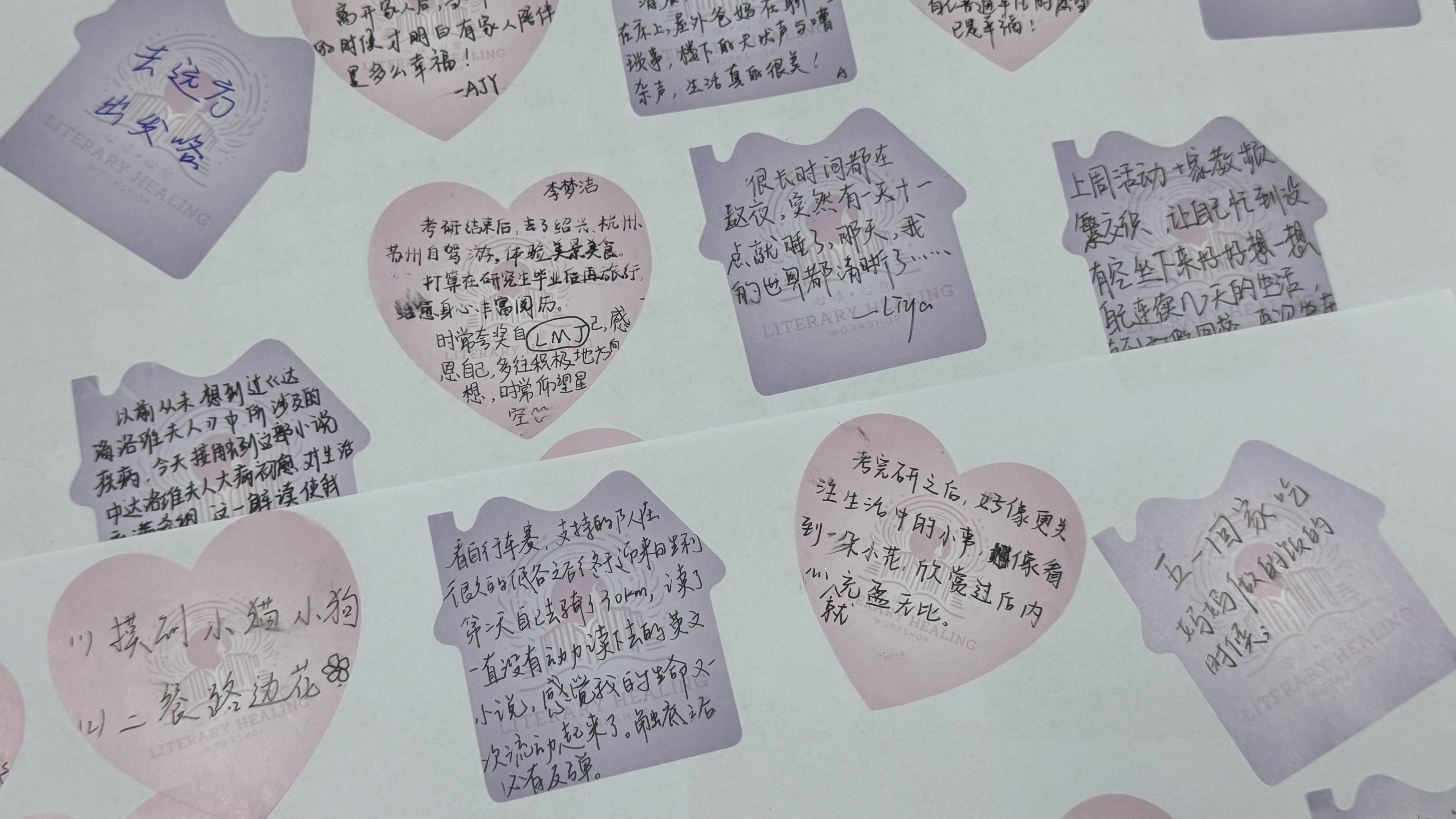 互动环节,同学们积极分享共鸣体验。研究生宋砚冰表示:“以前不确定文学是否真的具有疗愈作用,但今天的细读让我体会到,疗愈或许不是立即的抚慰,而是通过共鸣实现的内在转化”。同学们还在便利贴上写下感受,张贴在“心愈之墙”,一张张便签汇聚成共享情绪的柔光。