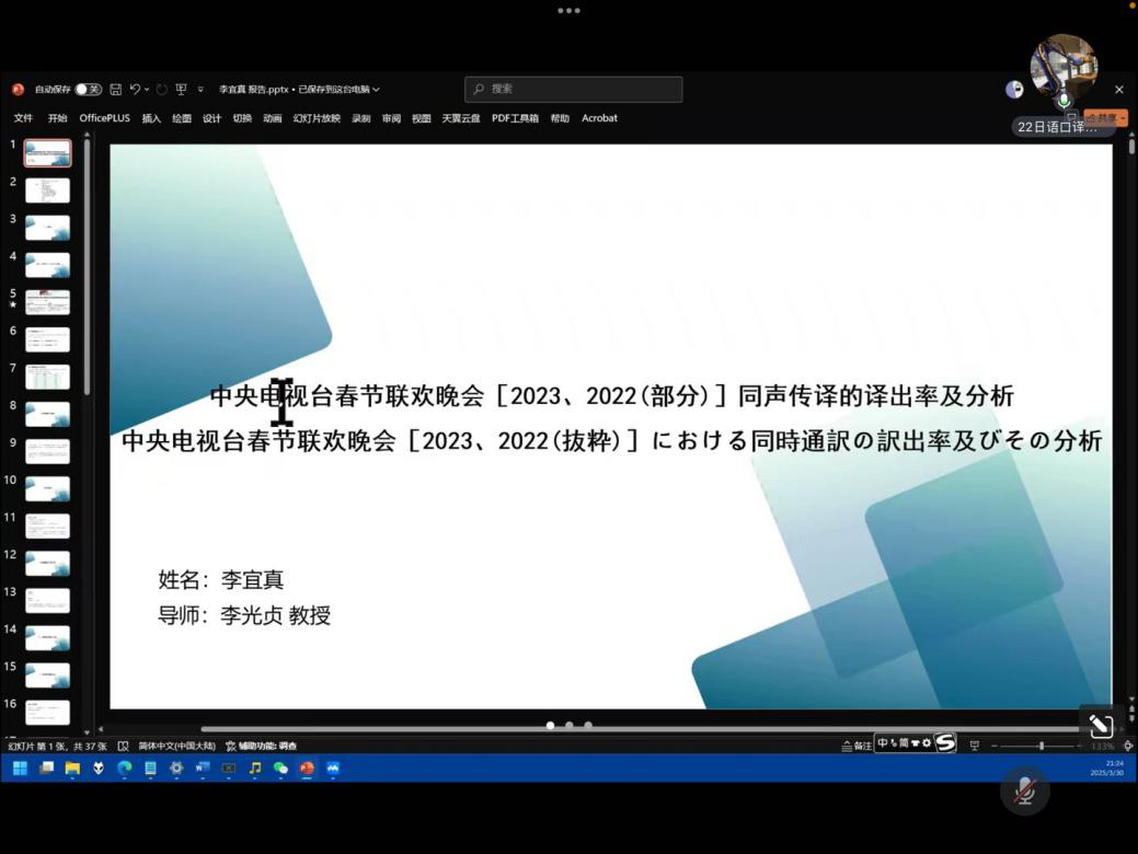 紧接着研究生李宜真以《中央电视台春节联欢晚会同声传译的译出率及分析》为题展开汇报。她以2022年中央广播电视总台春节联欢晚会(节选部分)以及2023年中央广播电视总台春节联欢晚会的同声传译内容作为分析对象,采用定量分析和数据处理的研究方法通过计算译出率,分析总结了影响译出率的因素,为提升同声传译的表现水平以及解决口译实务中的相关问题提供了新的视角参考。