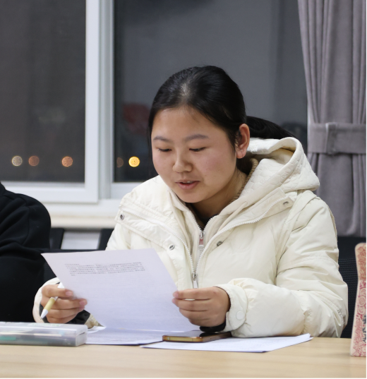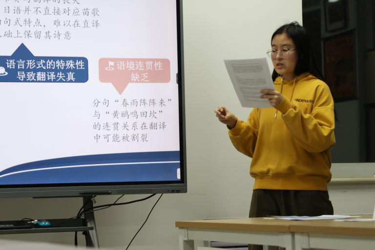 (2021级黄沛芝同学做题为“苗歌在日语翻译中的文化内涵传达与创新——以《苗年》中的苗歌翻译为例”的汇报)