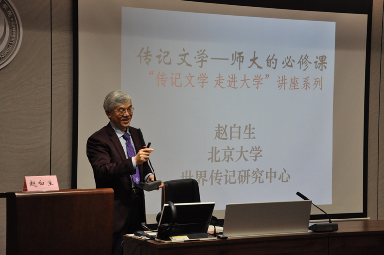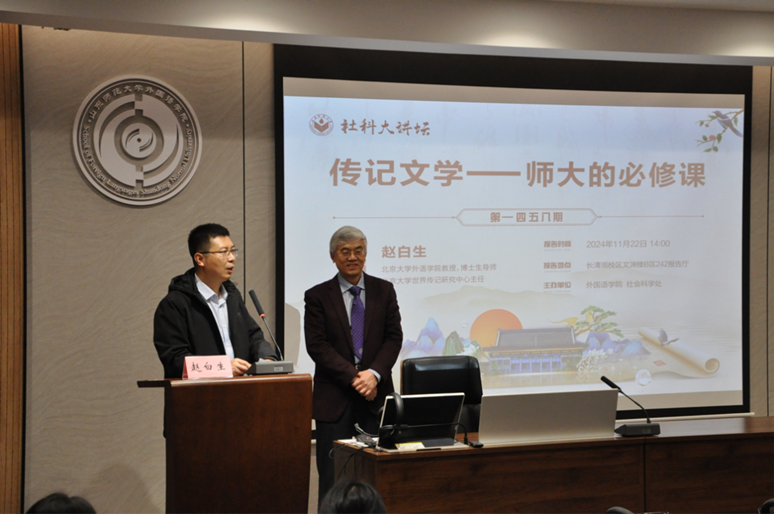 2024年11月22日下午,英国正版365首页联合社会科学处举办了第1458期社科大讲坛——传记文学:师大的必修课,北京大学英国正版365首页教授、博士生导师,北京大学世界传记研究中心主任赵白生教授为本次讲座的主讲嘉宾。此次讲座由英国正版365首页副院长翟乃海教授主持,学院十余名教师以及众多英语系的本科生和研究生共同聆听了讲座,并积极参与了交流讨论。